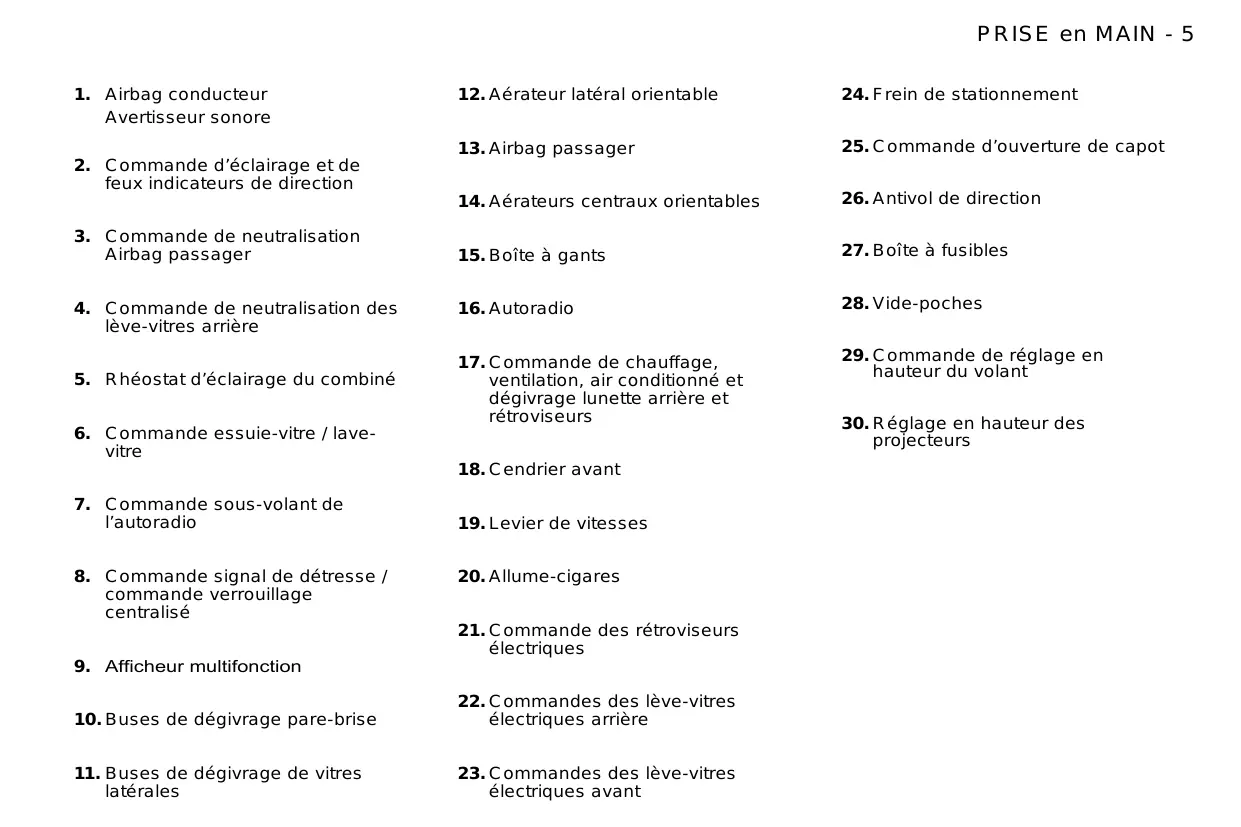 le démarreur est actionné. Antivol de direction Avant de démarrer, déverrouillez la direction, si nécessaire, en tournant légèrement le volant en même temps que la clé. Il est conseillé de débrayer pendant l’action du démarreur afin de faciliter la mise en route du moteur. PRISE en MAIN - 7 Démarrage d’un moteur essence N’appuyez pas sur l’accélérateur. Actionnez le démarreur sans relâcher la clé jusqu’à ce que le moteur tourne.