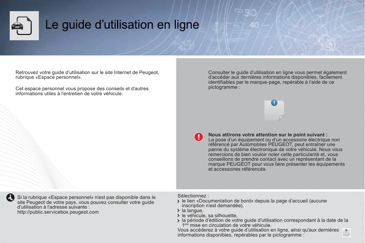 Retrouvez votre guide d’utilisation sur le site Internet de Peugeot, rubrique «Espace personnel». Cet espace personnel vous propose des conseils et d’autres informations utiles à l’entretien de votre véhicule. Consulter le guide d’utilisation en ligne vous permet également d’accéder aux dernières informations disponibles, facilement identifiables par le marque-page, repérable à l’aide de ce pictogramme : Nous attirons votre attention sur le point suivant : La pose d’un équipement ou d’un accessoire électrique non référencé par Automobiles PEUGEOT, peut entraîner une panne du système électronique de votre véhicule. Nous vous remercions de bien vouloir noter cette particularité et, vous conseillons de prendre contact avec un représentant de la marque PEUGEOT pour vous faire présenter les équipements et accessoires référencés. Si la rubrique «Espace personnel» n’est pas disponible dans le site Peugeot de votre pays, vous pouvez consulter votre guide d’utilisation à l’adresse suivante : http://public.servicebox.peugeot.com Sélectionnez : le lien «Documentation de bord» depuis la page d’accueil (aucune inscription n’est demandée), la langue, le véhicule, sa silhouette, la période d’édition de votre guide d’utilisation correspondant à la date de la 1ère mise en circulation de votre véhicule. Vous accéderez à votre guide d’utilisation en ligne, ainsi qu’aux dernières informations disponibles, repérables par le pictogramme : Bienvenue Nous vous remercions d’avoir choisi une 308. Ce guide d’utilisation est conçu afin de vous faire profiter pleinement de votre véhicule dans toutes ses situations de vie. Vous trouvez ainsi, dès les premières pages, un sommaire détaillé suivi d’une prise en main rapide destinée à faciliter la découverte de votre véhicule. Tous les détails propres à votre véhicule, confort, sécurité, informations pratiques, vous sont ensuite présentés dans ce guide pour mieux l’apprécier et pleinement en profiter. Chaque modèle peut ne reprendre qu’une partie des équipements mentionnés dans ce guide, selon le niveau de finition, les modèles, les versions et les caractéristiques propres au pays où il est commercialisé. Légende
