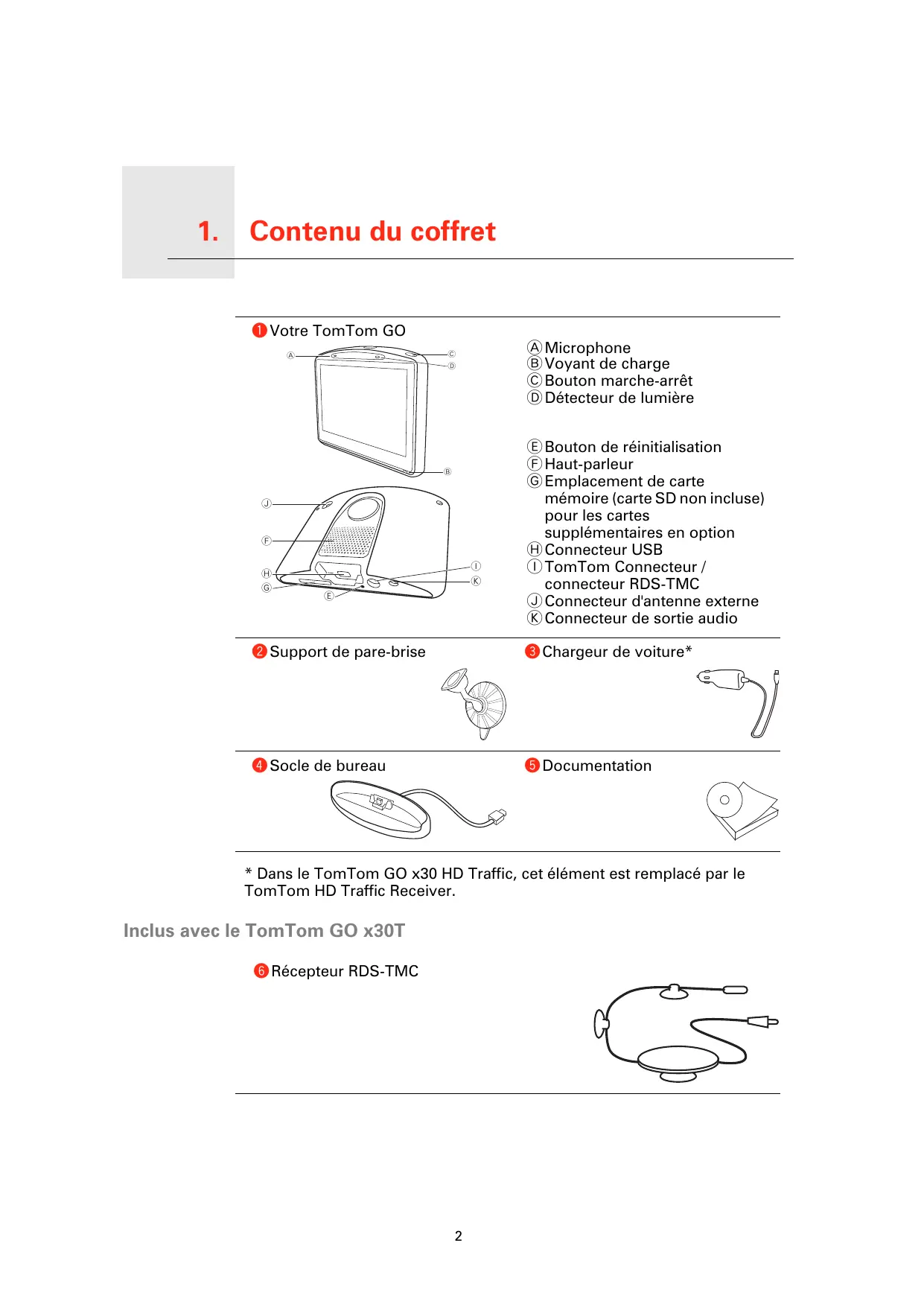 - Dans le TomTom GO x30 HD Traffic, cet élément est remplacé par le TomTom HD Traffic Receiver. Inclus avec le TomTom GO x30T f Récepteur RDS-TMC