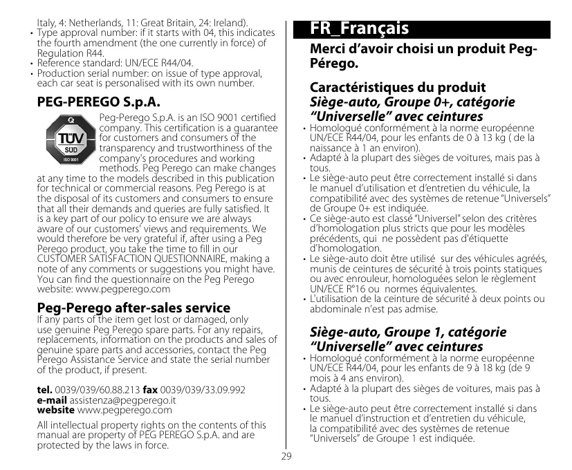 Merci d’avoir choisi un produit PegPérego. Caractéristiques du produit Siège-auto, Groupe 0+, catégorie “Universelle” avec ceintures