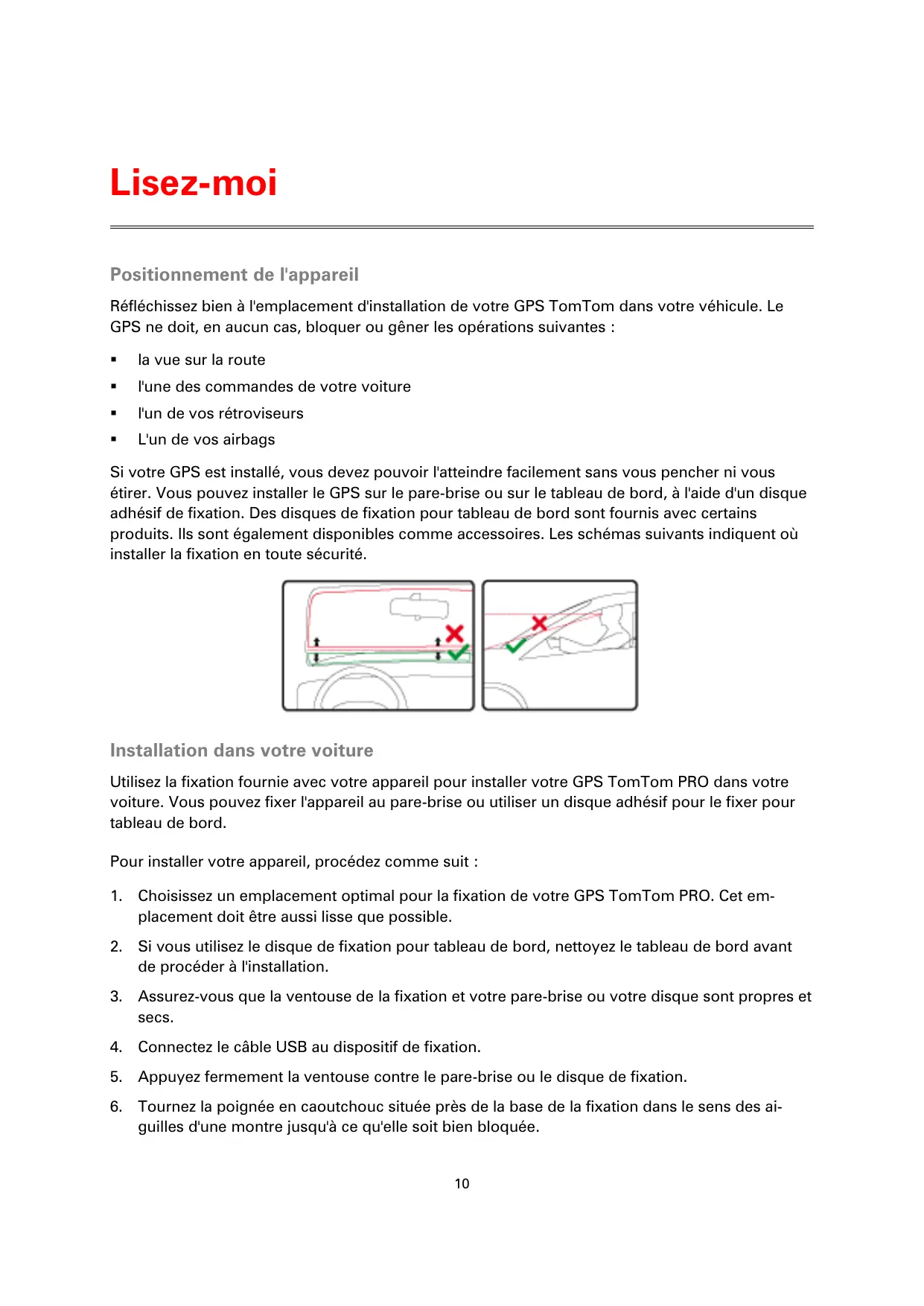 Lisez-moi Positionnement de l'appareil Réfléchissez bien à l'emplacement d'installation de votre GPS TomTom dans votre véhicule. Le GPS ne doit, en aucun cas, bloquer ou gêner les opérations suivantes :