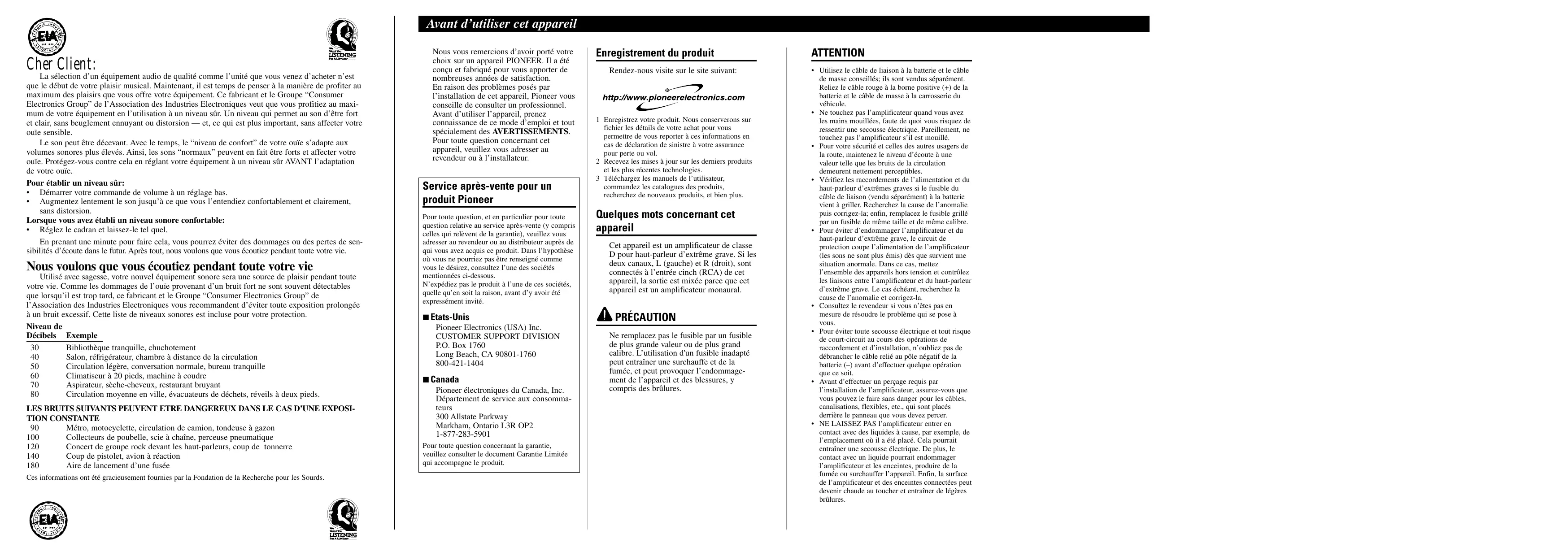 - Réglez le cadran et laissez-le tel quel. En prenant une minute pour faire cela, vous pourrez éviter des dommages ou des pertes de sensibilités d’écoute dans le futur. Après tout, nous voulons que vous écoutiez pendant toute votre vie. Nous voulons que vous écoutiez pendant toute votre vie Utilisé avec sagesse, votre nouvel équipement sonore sera une source de plaisir pendant toute votre vie. Comme les dommages de l’ouïe provenant d’un bruit fort ne sont souvent détectables que lorsqu’il est trop tard, ce fabricant et le Groupe “Consumer Electronics Group” de l’Association des Industries Electroniques vous recommandent d’éviter toute exposition prolongée à un bruit excessif. Cette liste de niveaux sonores est incluse pour votre protection. Niveau de Décibels Exemple Bibliothèque tranquille, chuchotement Salon, réfrigérateur, chambre à distance de la circulation Circulation légère, conversation normale, bureau tranquille Climatiseur à 20 pieds, machine à coudre Aspirateur, sèche-cheveux, restaurant bruyant Circulation moyenne en ville, évacuateurs de déchets, réveils à deux pieds. LES BRUITS SUIVANTS PEUVENT ETRE DANGEREUX DANS LE CAS D’UNE EXPOSITION CONSTANTE Métro, motocyclette, circulation de camion, tondeuse à gazon Collecteurs de poubelle, scie à chaîne, perceuse pneumatique Concert de groupe rock devant les haut-parleurs, coup de tonnerre Coup de pistolet, avion à réaction Aire de lancement d’une fusée Ces informations ont été gracieusement fournies par la Fondation de la Recherche pour les Sourds. Nous vous remercions d’avoir porté votre choix sur un appareil PIONEER. Il a été conçu et fabriqué pour vous apporter de nombreuses années de satisfaction. En raison des problèmes posés par l’installation de cet appareil, Pioneer vous conseille de consulter un professionnel. Avant d’utiliser l’appareil, prenez connaissance de ce mode d’emploi et tout spécialement des AVERTISSEMENTS. Pour toute question concernant cet appareil, veuillez vous adresser au revendeur ou à l’installateur. Service après-vente pour un produit Pioneer Pour toute question, et en particulier pour toute question relative au service après-vente (y compris celles qui relèvent de la garantie), veuillez vous adresser au revendeur ou au distributeur auprès de qui vous avez acquis ce produit. Dans l’hypothèse où vous ne pourriez pas être renseigné comme vous le désirez, consultez l’une des sociétés mentionnées ci-dessous. N’expédiez pas le produit à l’une de ces sociétés, quelle qu’en soit la raison, avant d’y avoir été expressément invité. 7 Etats-Unis Pioneer Electronics (USA) Inc.