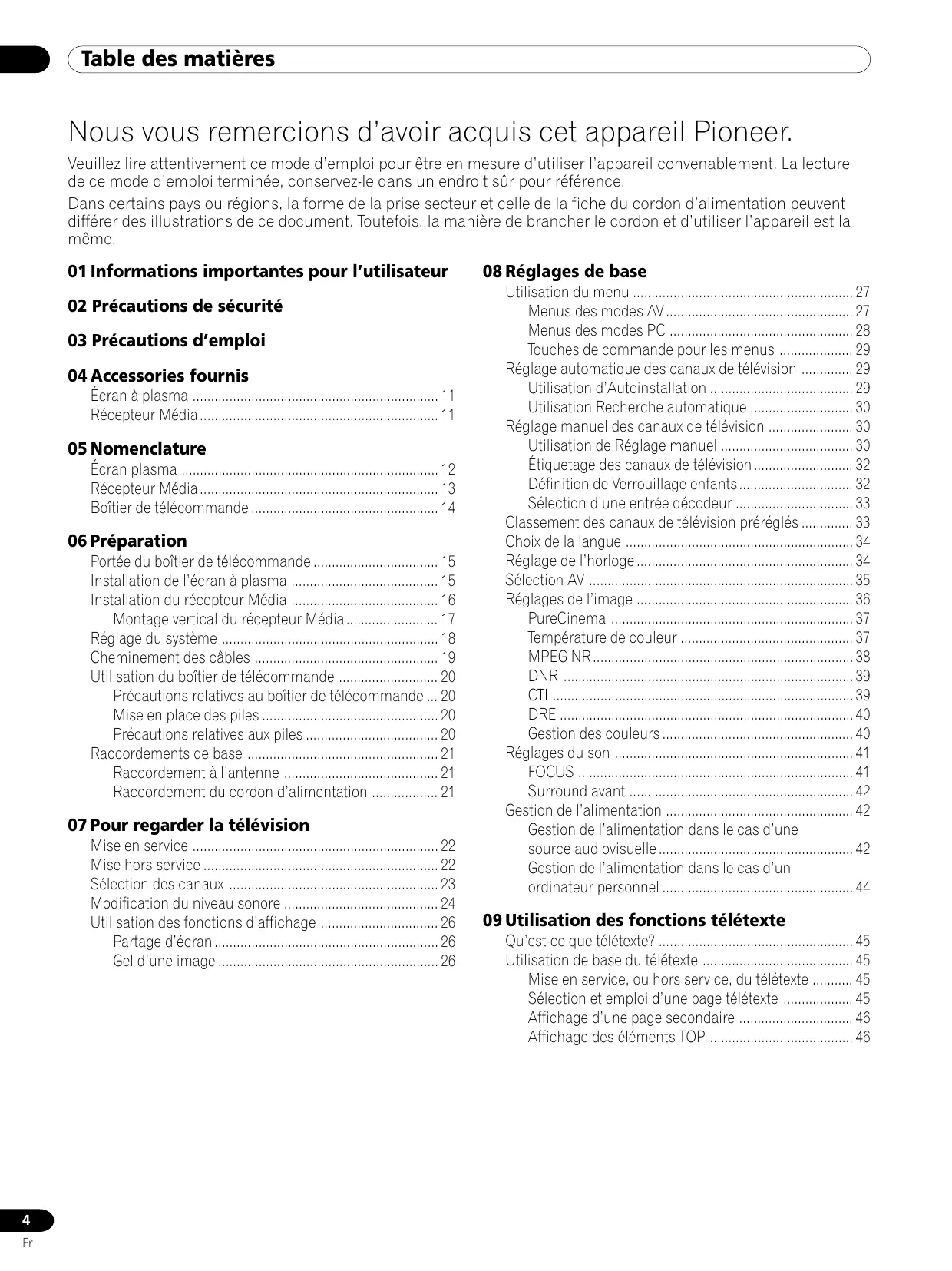 01 Informations importantes pour l’utilisateur 02 Précautions de sécurité 03 Précautions d’emploi 04 Accessories fournis Écran à plasma 11 Récepteur Média 11