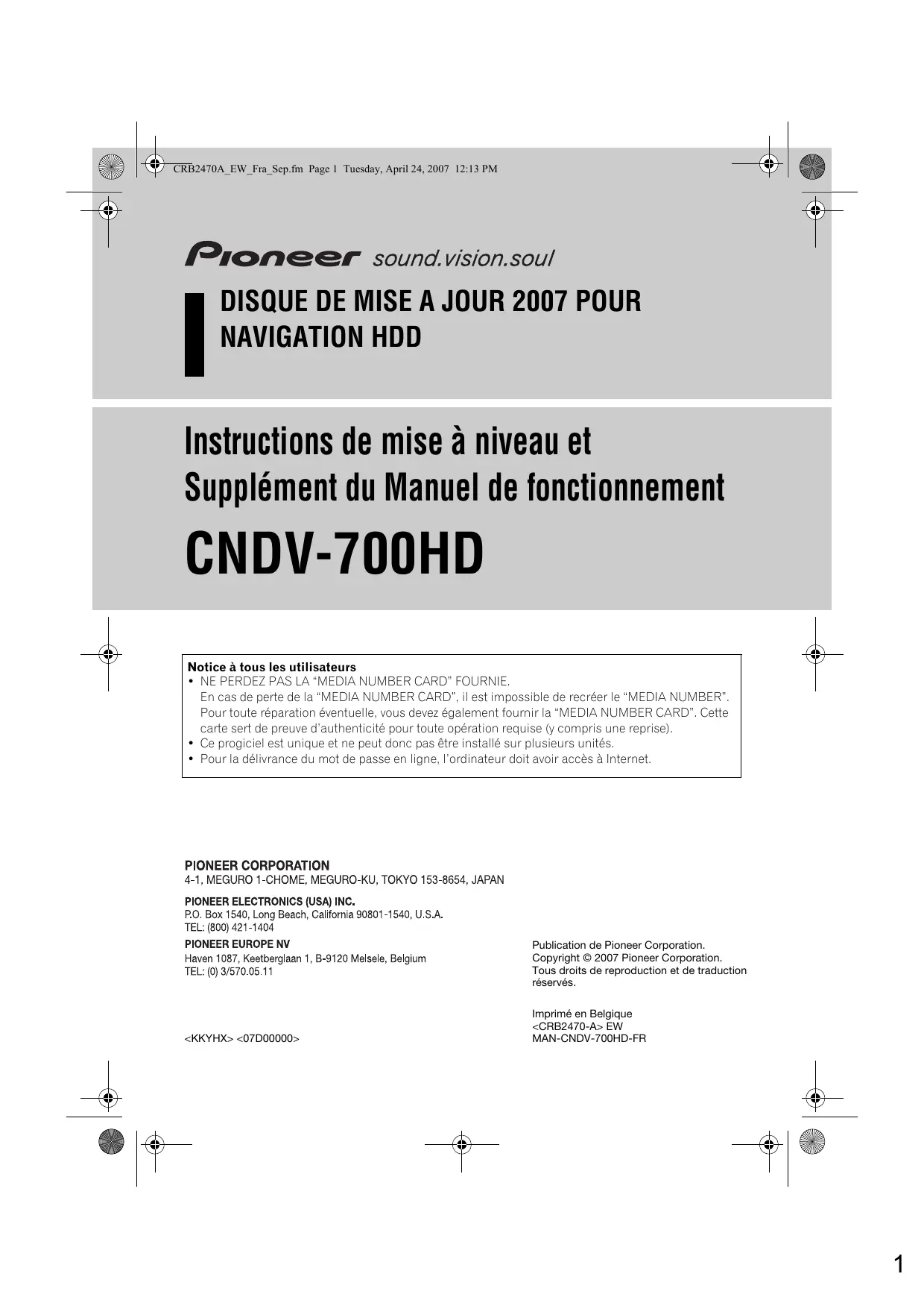 Haven 1087, Keetberglaan 1, B-9120 Melsele, Belgium TEL: (0) 3/570.05.11 Publié par Pioneer Corporation. Copyright © 2007 par Pioneer Corporation. Tous droits réservés. <KKYHX> <07D00000> Imprimé en Belgique