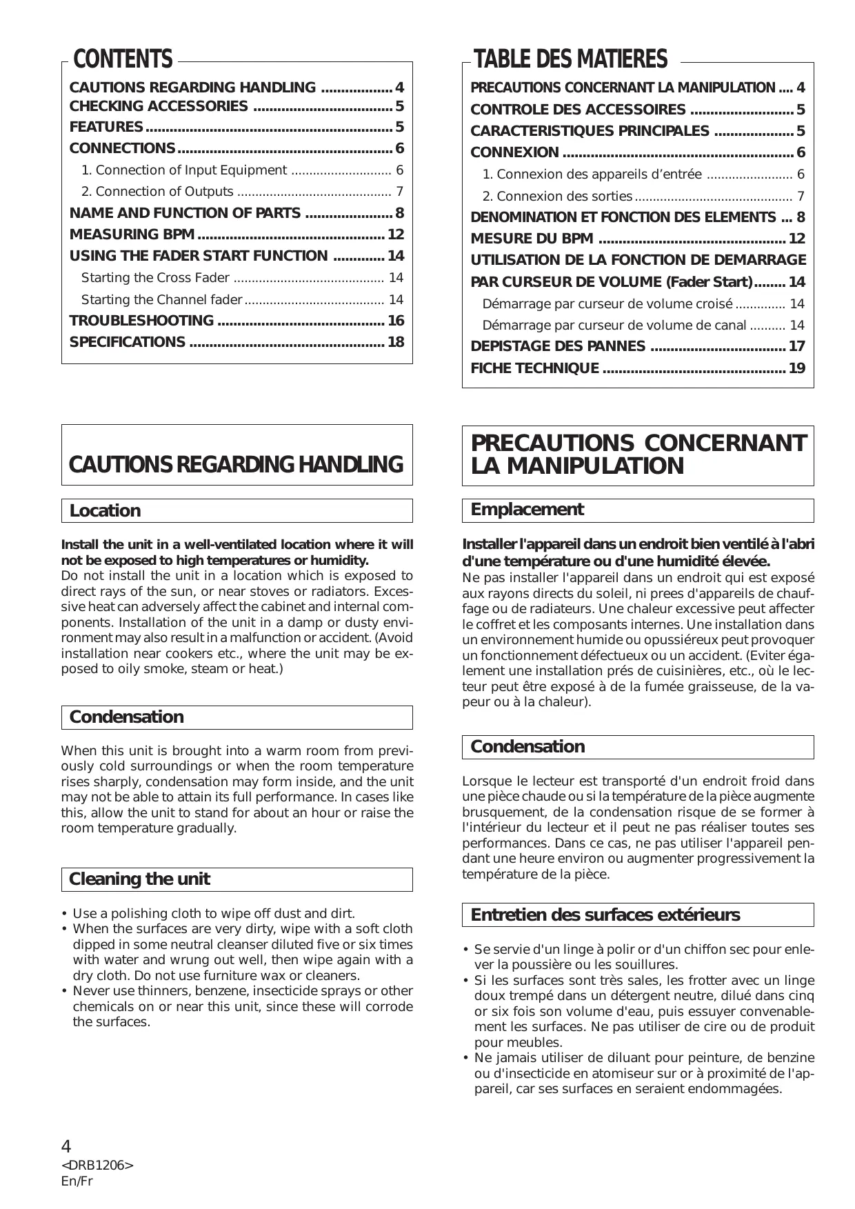 <DRB1206> En/Fr Installer l'appareil dans un endroit bien ventilé à l'abri d'une température ou d'une humidité élevée. Ne pas installer l'appareil dans un endroit qui est exposé aux rayons directs du soleil, ni prees d'appareils de chauf- fage ou de radiateurs. Une chaleur excessive peut affecter le coffret et les composants internes. Une installation dans un environnement humide ou opussiéreux peut provoquer un fonctionnement défectueux ou un accident. (Eviter éga- lement une installation prés de cuisinières, etc., où le lec- teur peut être exposé à de la fumée graisseuse, de la va- peur où à la chaleur). | Condensation Lorsque le lecteur est transporté d'un endroit froid dans une pièce chaude ou si la température de la pièce augmente brusquement, de la condensation risque de se former à l'intérieur du lecteur et il peut ne pas réaliser toutes ses performances. Dans ce cas, ne pas utiliser l'appareil pen- dant une heure environ ou augmenter progressivement la température de la pièce. [Entretien des surfaces extérieurs Se servie d'un linge à polir or d'un chiffon sec pour enle- ver la poussière ou les souillures. Si les surfaces sont très sales, les frotter avec un linge doux trempé dans un détergent neutre, dilué dans cinq or six fois son volume d'eau, puis essuyer convenable- ment les surfaces. Ne pas utiliser de cire ou de produit pour meubles. Ne jamais utiliser de diluant pour peinture, de benzine ou d'insecticide en atomiseur sur or à proximité de l'ap- pareil, car ses surfaces en seraient endommagées.