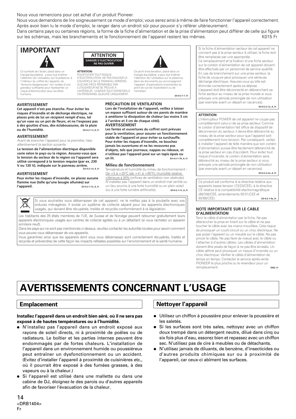 Tenir le câble d'alimentation par la fiche. Ne pas débrancher la prise en tirant sur le câble et ne pas toucher le câble avec les mains mouillées. Cela risque de provoquer un court-circuit ou un choc électrique. Ne pas poser l'appareil ou un meuble sur le câble. Ne pas pincer le câble. Ne pas faire de nœud avec le câble ou l'attacher à d'autres câbles. Les câbles d'alimentation doivent être posés de façon à ne pas être écrasés. Un câble abîmé peut provoquer un risque d'incendie ou un choc électrique. Vérifier le câble d'alimentation de temps en temps. Contacter le service après-vente PIONEER le plus proche ou le revendeur pour un remplacement. S002. Fr