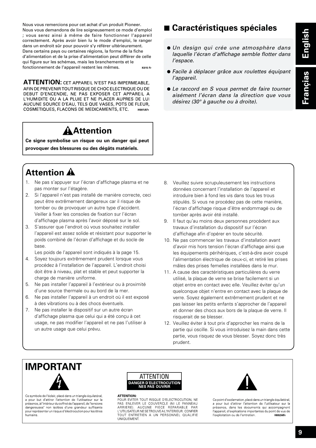 Ne pas s’appuyer sur l’écran d’affichage plasma et ne pas monter sur l’étagère. Si l’appareil n’est pas installé de manière correcte, ceci peut être extrêmement dangereux car il risque de tomber ou de provoquer un autre type d’accident. Veiller à fixer les consoles de fixation sur l’écran d’affichage plasma après l’avoir déposé sur le sol. S’assurer que l’endroit où vous souhaitez installer l’appareil est assez solide et résistant pour supporter le poids combiné de l’écran d’affichage et du socle de base. Les poids de l’appareil sont indiqués à la page 15. Soyez toujours extrêmement prudent lorsque vous procédez à l’installation de l’appareil. L’endroit choisi doit être à niveau, plat et stable et peut supporter la charge de manière uniforme. Ne pas installer l’appareil à l’extérieur ou à proximité d’une source thermale ou au bord de la mer. Ne pas installer l’appareil à un endroit où il est exposé à des vibrations ou à des chocs éventuels. Ne pas installer le dispositif sur un autre écran d’affichage plasma que celui qui a été conçu à cet usage, ne pas modifier l’appareil et ne pas l’utiliser à un autre usage que celui prévu.