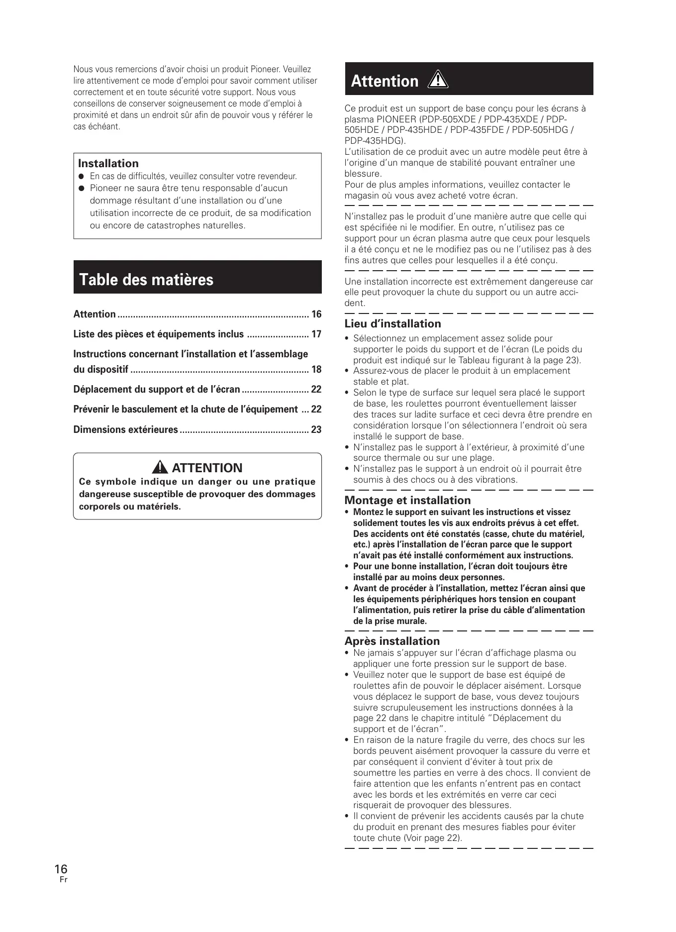 Nous vous remercions d'avoir choisi un produit Pioneer. Veuillez lire attentivement ce mode d'emploi pour savoir comment utiliser correctement et en toute sécurité votre support. Nous vous conseillons de conserver soigneusement ce mode d'emploi à proximité et dans un endroit sûr afin de pouvoir vous y référer le cas échéant. Installation © En cas de difficultés, veuillez consulter votre revendeur. © Pioneer ne saura être tenu responsable d'aucun dommage résultant d'une installation ou d'une utilisation incorrecte de ce produit, de sa modification ou encore de catastrophes naturelles able des matières Attention . Liste des pièces et équipements inclus … Instructions concernant l'installation et l'assemblage du dispositif Déplacement du support et de l'écran. Prévenir le basculement et la chute de l'équipement … 22 Dimensions extérieures À ATTENTION Ce symbole indique un danger ou une pratique dangereuse susceptible de provoquer des dommages corporels ou matériels. Attention À Ce produit est un support de base conçu pour les écrans à plasma PIONEER (PDP-505XDE / PDP-435XDE / PDP- SOSHDE / PDP-436HDE / PDP-435FDE / PDP-505HDG / PDP-435HDG). L'utilisation de ce produit avec un autre modèle peut être à l'origine d'un manque de stabilité pouvant entraîner une blessure. Pour de plus amples informations, veuillez contacter le magasin où vous avez acheté votre écran. N'installez pas le produit d'une manière autre que celle qui est spécifiée ni le modifier. En outre, n'utilisez pas ce support pour un écran plasma autre que ceux pour lesquels il a été conçu et ne le modifiez pas ou ne l'utilisez pas à des fins autres que celles pour lesquelles il a été conçu. Une installation incorrecte est extrêmement dangereuse car elle peut provoquer la chute du support où un autre acci- dent + Sélectionnez un emplacement assez solide pour supporter le poids du support et de l'écran (Le poids du produit est indiqué sur le Tableau figurant à la page 23). Assurez-vous de placer le produit à un emplacement stable et plat. Selon le type de surface sur lequel sera placé le support de base, les roulettes pourront éventuellement laisser des traces sur ladite surface et ceci devra être prendre en considération lorsque l'on sélectionnera l'endroit où sera installé le support de base. N'installez pas le support à l'extérieur, à proximité d'une source thermale ou sur une plage. N'installez pas le support à un endroit où il pourrait être soumis à des chocs ou à des vibrations. Montage et installation Montez le support en suivant les instructions et vissez solidement toutes les vis aux endroits prévus à cet effet. Des accidents ont été constatés (casse, chute du matériel, etc.) après l'installation de l'écran parce que le support n'avait pas été installé conformément aux instructions. Pour une bonne installation, l'écran doit toujours être installé par au moins deux personnes. Avant de procéder à l'installation, mettez l'écran ainsi que les équipements périphériques hors tension en coupant l'alimentation, puis retirer la prise du câble d'alimentation de la prise murale. Après installation + Ne jamais s'appuyer sur l'écran d'affichage plasma ou appliquer une forte pression sur le support de base. Veuillez noter que le support de base est équipé de roulettes afin de pouvoir le déplacer aisément. Lorsque vous déplacez le support de base, vous devez toujours suivre scrupuleusement les instructions données à la page 22 dans le chapitre intitulé “Déplacement du support et de l'écran”. En raison de la nature fragile du verre, des chocs sur les bords peuvent aisément provoquer la cassure du verre et par conséquent il convient d'éviter à tout prix de soumettre les parties en verre à des chocs. Il convient de faire attention que les enfants n'entrent pas en contact avec les bords et les extrémités en verre car ceci risquerait de provoquer des blessures. Il convient de prévenir les accidents causés par la chute du produit en prenant des mesures fiables pour éviter toute chute (Voir page 22).