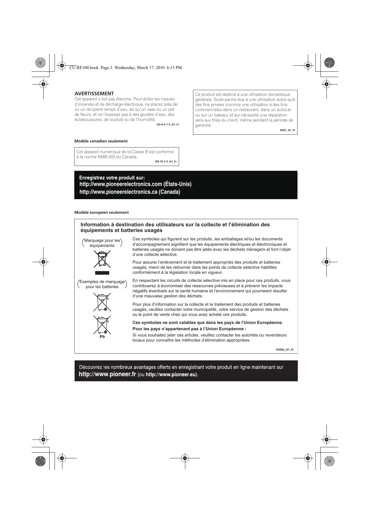 Enregistrez votre produit sur: http://www.pioneerelectronics.com (États-Unis) http://www.pioneerelectronics.ca (Canada)