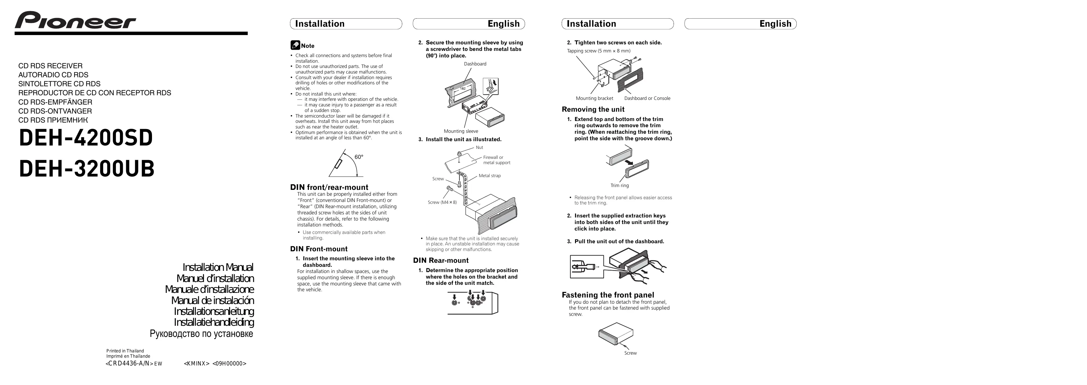 garniture vers l’extérieur pour retirer la garniture. (Quand vous remontez l’anneau de garniture, pointez le côté avec la rainure vers le bas.) Pare-feu ou support métallique 60° Cet appareil peut être installé correctement par “l’avant” (montage avant conventionnel DIN) ou par “l’arrière” (montage par l’arrière DIN, en utilisant les trous taraudés de chaque côté du châssis de l’appareil). Pour les détails, reportez-vous aux méthodes d’installation suivantes.