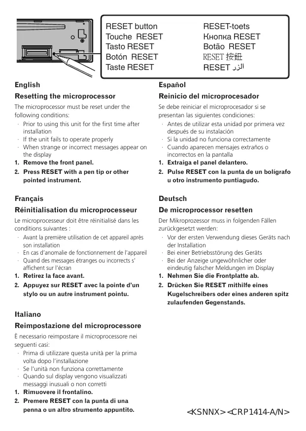 RESET button Touche RESET Tasto RESET Botôn RESET Taste RESET RESET-toets HHonka RESET Botäo RESET RESET ff RESET 5! English Resetting the microprocessor The microprocessor must be reset under the following conditions: Prior to using this unit for the first time after installation I the unit fail to operate properhy When strange or incorrect messages appear on the display Remove the front panel. Press RESET with a pen tip or other Français Réinitialisation du microprocesseur Le microprocesseur doit être réinitialisé dans les conditions suivantes Avant la première utisation de cet appareil après son instalation En cas d'anomalie de fonctionnement de l'appareil Quand des messages étranges ou incorrect s affichent sur l'écran . Retirez la face avant.