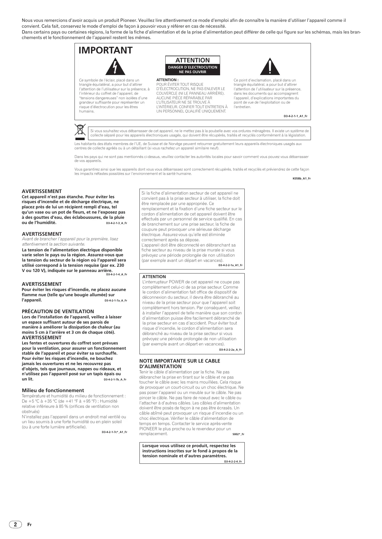 Lors de l’installation de l’appareil, veillez à laisser un espace suffisant autour de ses parois de manière à améliorer la dissipation de chaleur (au moins 5 cm à l’arrière et 3 cm de chaque côté). AVERTISSEMENT Les fentes et ouvertures du coffret sont prévues pour la ventilation, pour assurer un fonctionnement stable de l’appareil et pour éviter sa surchauffe. Pour éviter les risques d’incendie, ne bouchez jamais les ouvertures et ne les recouvrez pas d’objets, tels que journaux, nappes ou rideaux, et n’utilisez pas l’appareil posé sur un tapis épais ou D3-4-2-1-7b_A_Fr un lit. Milieu de fonctionnement Température et humidité du milieu de fonctionnement : De +5 °C à +35 °C (de +41 °F à +95 °F) ; Humidité relative inférieure à 85 % (orifices de ventilation non obstrués) N’installez pas l’appareil dans un endroit mal ventilé ou un lieu soumis à une forte humidité ou en plein soleil (ou à une forte lumière artificielle). D3-4-2-1-7c*_A1_Fr Si la fiche d’alimentation secteur de cet appareil ne convient pas à la prise secteur à utiliser, la fiche doit être remplacée par une appropriée. Ce remplacement et la fixation d’une fiche secteur sur le cordon d’alimentation de cet appareil doivent être effectués par un personnel de service qualifié. En cas de branchement sur une prise secteur, la fiche de coupure peut provoquer une sérieuse décharge électrique. Assurez-vous qu’elle est éliminée correctement après sa dépose. L’appareil doit être déconnecté en débranchant sa fiche secteur au niveau de la prise murale si vous prévoyez une période prolongée de non utilisation (par exemple avant un départ en vacances). D3-4-2-2-1a_A1_Fr ATTENTION L’interrupteur POWER de cet appareil ne coupe pas complètement celui-ci de sa prise secteur. Comme le cordon d’alimentation fait office de dispositif de déconnexion du secteur, il devra être débranché au niveau de la prise secteur pour que l’appareil soit complètement hors tension. Par conséquent, veillez à installer l’appareil de telle manière que son cordon d’alimentation puisse être facilement débranché de la prise secteur en cas d’accident. Pour éviter tout risque d’incendie, le cordon d’alimentation sera débranché au niveau de la prise secteur si vous prévoyez une période prolongée de non utilisation (par exemple avant un départ en vacances). D3-4-2-2-2a_A_Fr Tenir le câble d’alimentation par la fiche. Ne pas débrancher la prise en tirant sur le câble et ne pas toucher le câble avec les mains mouillées. Cela risque de provoquer un court-circuit ou un choc électrique. Ne pas poser l’appareil ou un meuble sur le câble. Ne pas pincer le câble. Ne pas faire de noeud avec le câble ou l’attacher à d’autres câbles. Les câbles d’alimentation doivent être posés de façon à ne pas être écrasés. Un câble abîmé peut provoquer un risque d’incendie ou un choc électrique. Vérifier le câble d’alimentation de temps en temps. Contacter le service après-vente PIONEER le plus proche ou le revendeur pour un remplacement. S002*_Fr Lorsque vous utilisez ce produit, respectez les instructions inscrites sur le fond à propos de la tension nominale et d’autres paramètres. D3-4-2-2-4_Fr