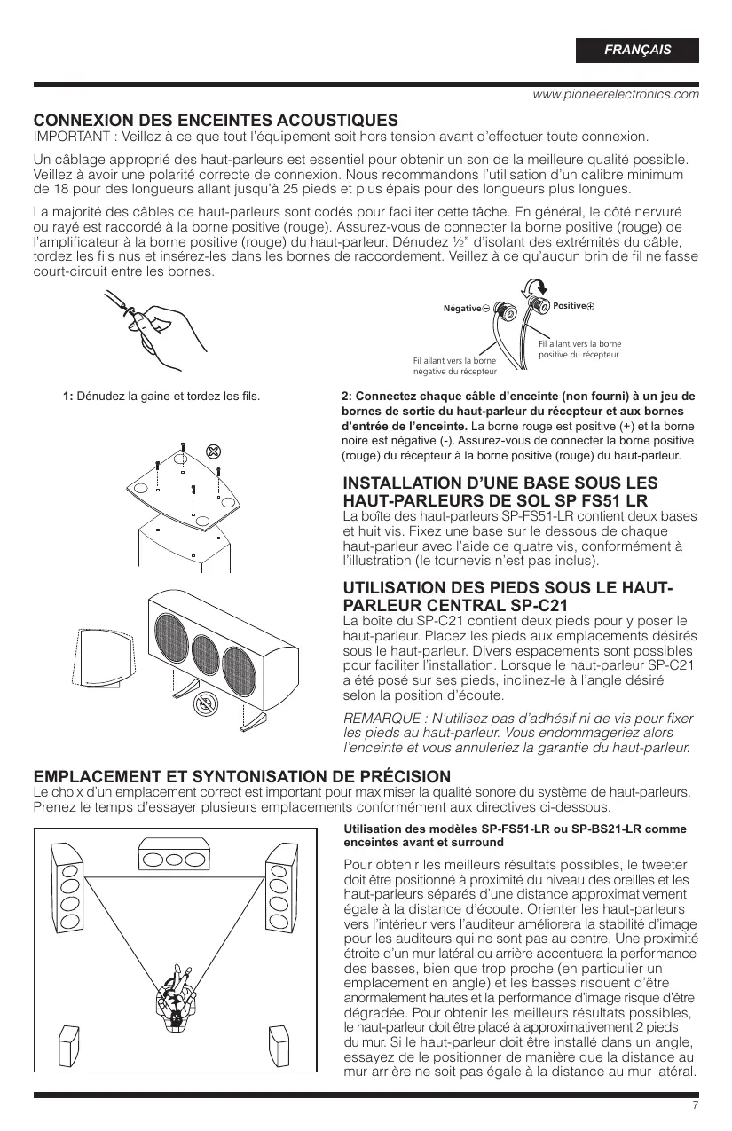 • N’oubliez pas que les modèles SP-FS51-LR, SP-BS21-LR et SP-C21 sont particulièrement lourds et que, par conséquent, il est dangereux de les installer dans des endroits élevés tels que sur des murs ou des piliers, ou tout autre endroit instable à moins de les sécuriser correctement en place. Pioneer n’assume aucune responsabilité en cas d’accidents ou de dégâts causés par une installation inadéquate. Le modèle SP-C21 est muni d’un blindage magnétique. Toutefois, si les enceintes acoustiques sont installées trop près de l’écran d’un téléviseur, une distorsion de couleur risque de se produire. Dans ce cas, mettez le téléviseur hors tension et rallumez-le au bout de 15 à 30 minutes. Si le problème persiste, éloignez les enceintes acoustiques du téléviseur.