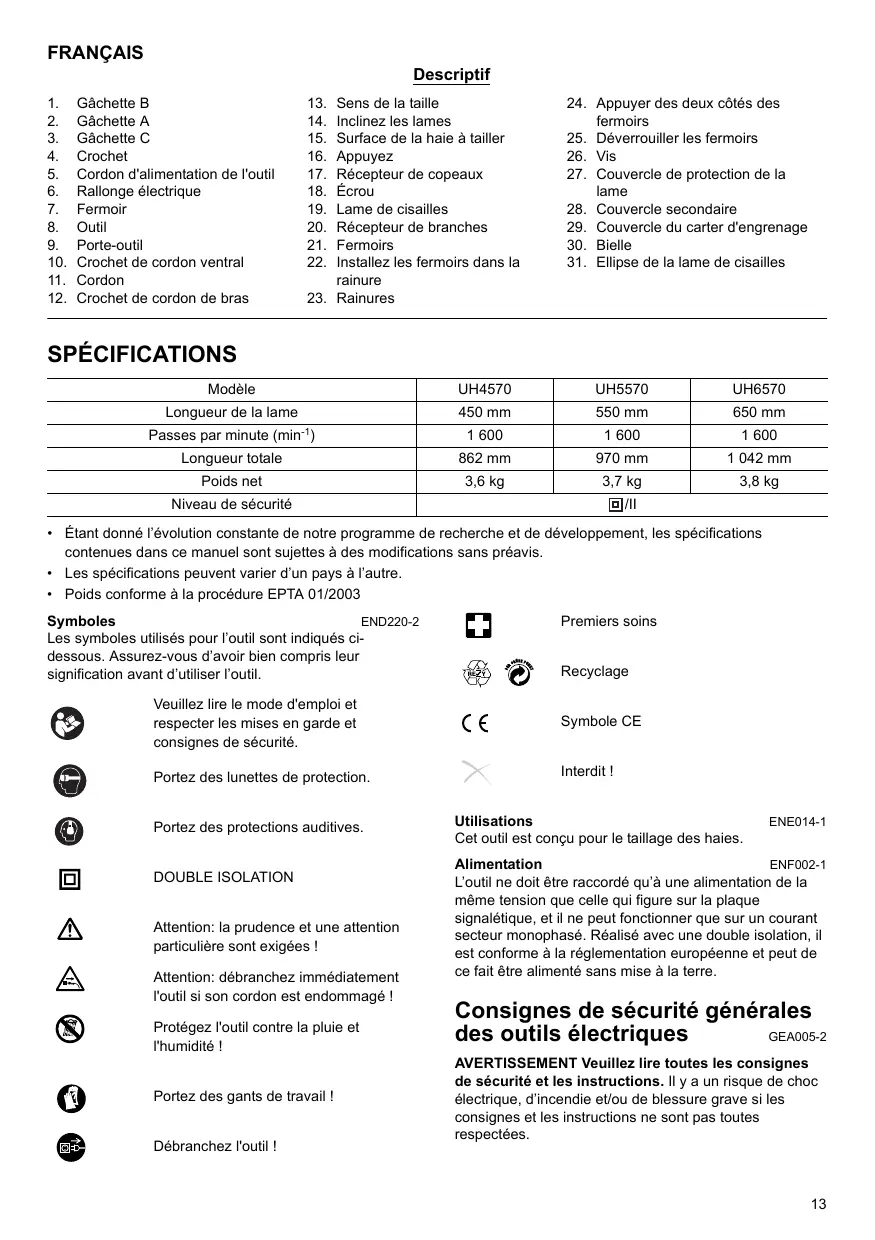 • Ces accessoires ou pièces complémentaires sont recommandés pour l’utilisation avec l’outil Makita spécifié dans ce manuel. L’utilisation de tout autre accessoire ou pièce complémentaire comporte un risque de blessures. Utilisez uniquement l’accessoire ou la pièce complémentaire dans le but spécifié. Pour obtenir plus de détails sur ces accessoires, contactez un Centre de service après-vente local Makita. • Couvercle de protection de la lame • Crochet • Lame de cisailles • Crochet de cordon ventral • Crochet de cordon de bras Pour les pays européens uniquement Bruit ENG102-2 Les niveaux de bruit pondéré A typiques ont été mesurés selon la norme EN60745 : Niveau de pression sonore (LpA) : 89,9 dB (A) Niveau de puissance sonore (LWA) : 97,9 dB (A) Incertitude (K) : 1,5 dB (A) Portez des protections auditives Vibration ENG231-1 La valeur totale de vibration (somme du vecteur triaxial) déterminée selon la norme EN60745 : Mode de fonctionnement : taillage de haie Émission de vibrations (ah) : 6,7 m/s2 Incertitude (K) : 1,5 m/s2 Déclaration de conformité CE ENH021-2 Nous, Makita Corporation, en tant que fabricant responsable, déclarons que les machines Makita suivantes : Nom de la machine : Taille-haie N° de modèle/ Type : UH4570, UH5570, UH6570 sont fabriquées en série et sont conformes aux directives européennes suivantes : 2000/14/CE, 98/37/CE jusqu’au 28 décembre 2009 puis, à partir du 29 décembre 2009, à la 2006/42/CE et sont produites conformément aux normes ou documents de normalisation suivants : EN60745 La documentation technique est disponible auprès de notre représentant en Europe qui est : Makita International Europe Ltd, Michigan, Drive, Tongwell, Milton Keynes, MK15 8JD, Angleterre