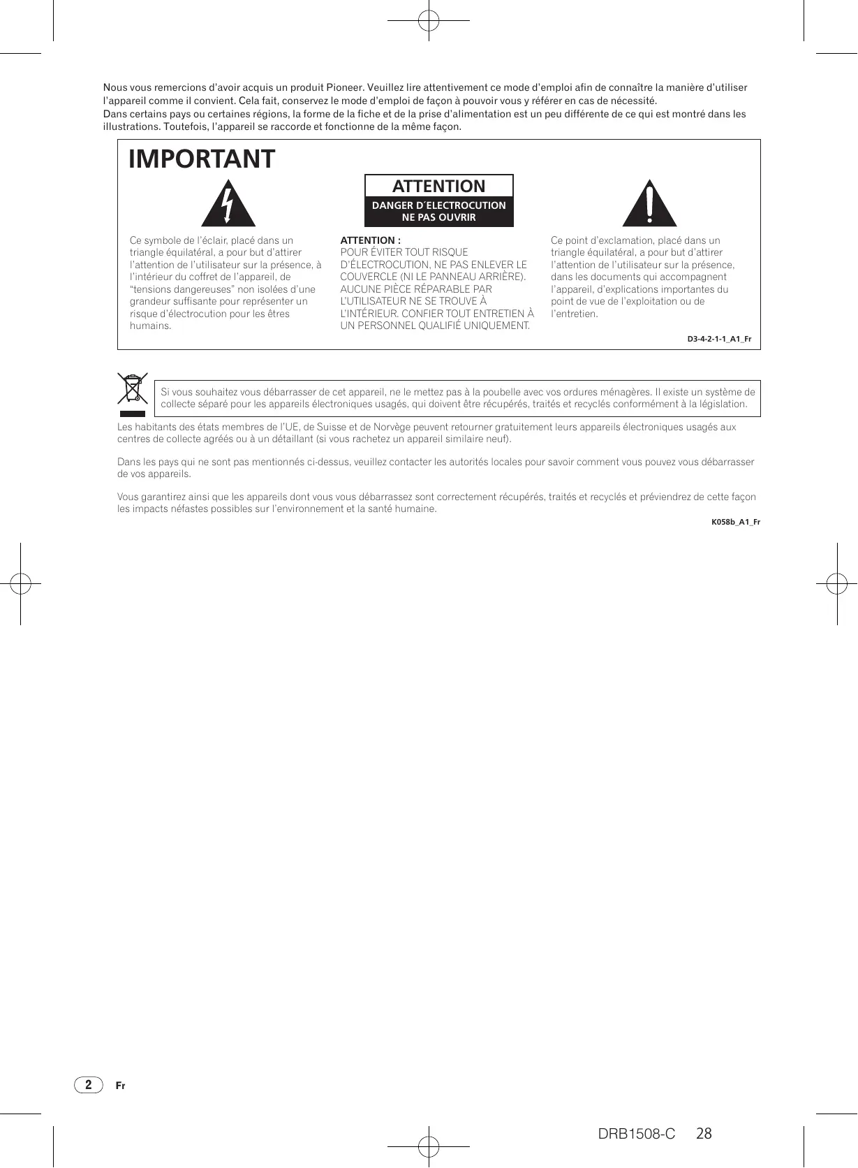 Nous vous remercions d’avoir acquis un produit Pioneer. Veuillez lire attentivement ce mode d’emploi afin de connaître la manière d’utiliser l’appareil comme il convient. Cela fait, conservez le mode d’emploi de façon à pouvoir vous y référer en cas de nécessité. Dans certains pays ou certaines régions, la forme de la fiche et de la prise d’alimentation est un peu différente de ce qui est montré dans les illustrations. Toutefois, l’appareil se raccorde et fonctionne de la même façon. IMPORTANT ATTENTION