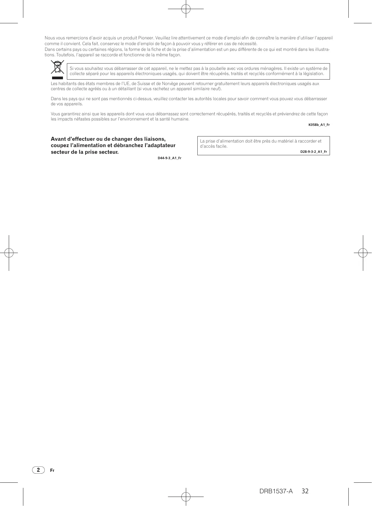 Nous vous remercions d’avoir acquis un produit Pioneer. Veuillez lire attentivement ce mode d’emploi afin de connaître la manière d’utiliser l’appareil comme il convient. Cela fait, conservez le mode d’emploi de façon à pouvoir vous y référer en cas de nécessité. Dans certains pays ou certaines régions, la forme de la fiche et de la prise d’alimentation est un peu différente de ce qui est montré dans les illustrations. Toutefois, l’appareil se raccorde et fonctionne de la même façon. Si vous souhaitez vous débarrasser de cet appareil, ne le mettez pas à la poubelle avec vos ordures ménagères. Il existe un système de collecte séparé pour les appareils électroniques usagés, qui doivent être récupérés, traités et recyclés conformément à la législation. Les habitants des états membres de l’UE, de Suisse et de Norvège peuvent retourner gratuitement leurs appareils électroniques usagés aux centres de collecte agréés ou à un détaillant (si vous rachetez un appareil similaire neuf). Dans les pays qui ne sont pas mentionnés ci-dessus, veuillez contacter les autorités locales pour savoir comment vous pouvez vous débarrasser de vos appareils. Vous garantirez ainsi que les appareils dont vous vous débarrassez sont correctement récupérés, traités et recyclés et préviendrez de cette façon les impacts néfastes possibles sur l’environnement et la santé humaine. K058b_A1_Fr Avant d’effectuer ou de changer des liaisons, coupez l’alimentation et débranchez l’adaptateur secteur de la prise secteur. La prise d’alimentation doit être près du matériel à raccorder et d’accès facile. D28-9-3-2_A1_Fr D44-9-3_A1_Fr