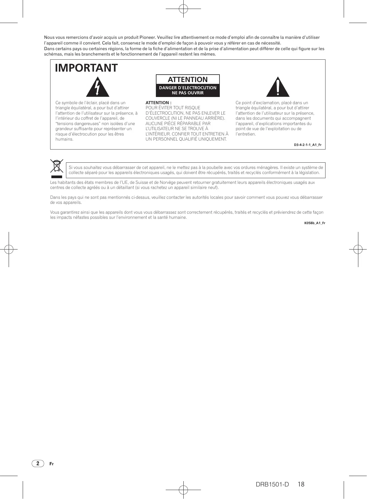 Nous vous remercions d’avoir acquis un produit Pioneer. Veuillez lire attentivement ce mode d’emploi afin de connaître la manière d’utiliser l’appareil comme il convient. Cela fait, conservez le mode d’emploi de façon à pouvoir vous y référer en cas de nécessité. Dans certains pays ou certaines régions, la forme de la fiche d’alimentation et de la prise d’alimentation peut différer de celle qui figure sur les schémas, mais les branchements et le fonctionnement de l’appareil restent les mêmes. IMPORTANT ATTENTION