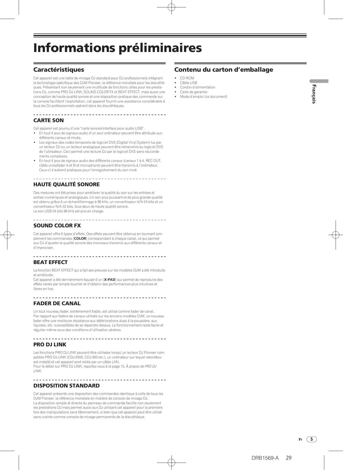 Informations préliminaires Caractéristiques Contenu du carton d’emballage Cet appareil est une table de mixage DJ standard pour DJ professionnels intégrant la technologie spécifique des DJM Pioneer, la référence mondiale pour les discothèques. Présentant non seulement une multitude de fonctions utiles pour les prestations DJ, comme PRO DJ LINK, SOUND COLOR FX et BEAT EFFECT, mais aussi une conception de haute qualité sonore et une disposition pratique des commande sur la console facilitant l’exploitation, cet appareil fournit une assistance considérable à tous les DJ professionnels opérant dans les discothèques.
