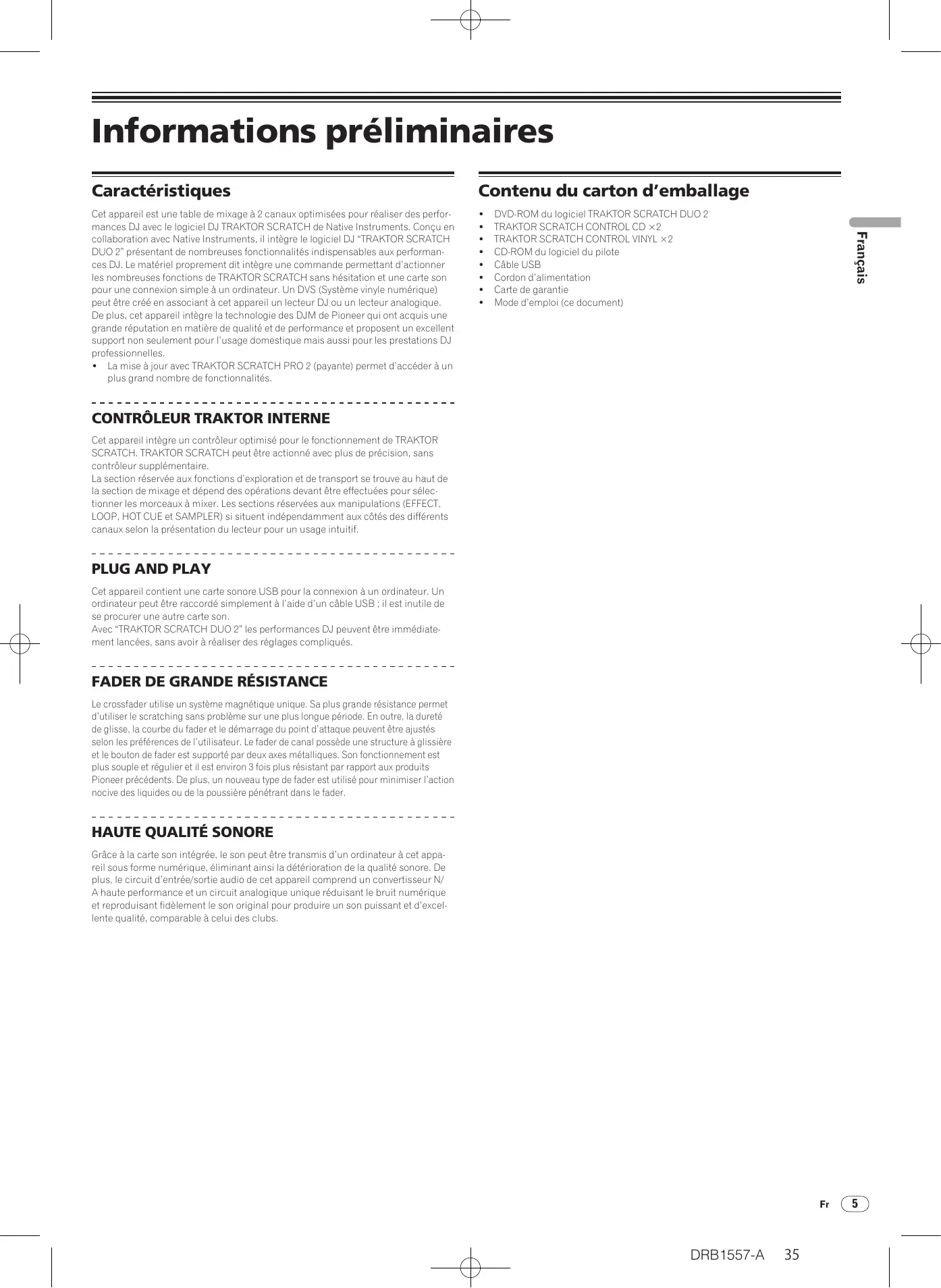 Grâce à la carte son intégrée, le son peut être transmis d'un ordinateur à cet appa: reil sous forme numérique, éliminant ainsi la détérioration de la qualité sonore. De plus, le circuit d'entrée/sortie audio de cet appareil comprend un convertisseur N/ A haute performance et un circuit analogique unique réduisant le bruit numérique et reproduisant fidèlement le son original pour produire un son puissant et d'excel lente qualité, comparable à celui des clubs. Contenu du carton d'emballage DVD-ROM du logiciel TRAKTOR SCRATCH DUO 2 TRAKTOR SCRATCH CONTROL CD x2 TRAKTOR SCRATCH CONTROL VINYL x2 CD-ROM du logiciel du pilote Cäble USB Cordon d'alimentation Carte de garantie Mode d'emploi (ce document) DRB1557-A