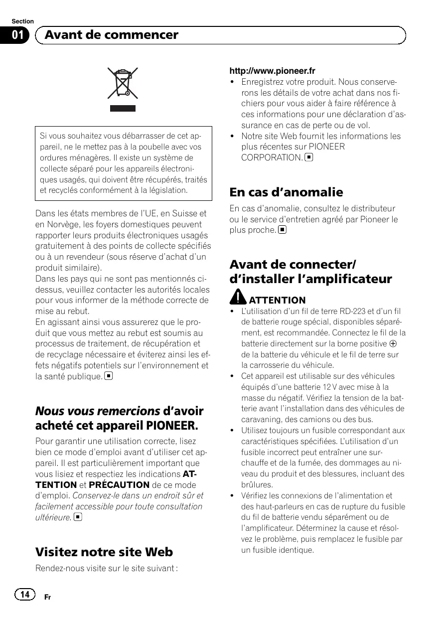 http://www.pioneer.fr ! Enregistrez votre produit. Nous conserverons les détails de votre achat dans nos fichiers pour vous aider à faire référence à ces informations pour une déclaration d’assurance en cas de perte ou de vol. ! Notre site Web fournit les informations les plus récentes sur PIONEER CORPORATION. En cas d’anomalie En cas d’anomalie, consultez le distributeur ou le service d’entretien agréé par Pioneer le plus proche. Avant de connecter/ d’installer l’amplificateur ATTENTION ! L’utilisation d’un fil de terre RD-223 et d’un fil de batterie rouge spécial, disponibles séparément, est recommandée. Connectez le fil de la batterie directement sur la borne positive + de la batterie du véhicule et le fil de terre sur la carrosserie du véhicule. ! Cet appareil est utilisable sur des véhicules équipés d’une batterie 12 V avec mise à la masse du négatif. Vérifiez la tension de la batterie avant l’installation dans des véhicules de caravaning, des camions ou des bus. ! Utilisez toujours un fusible correspondant aux caractéristiques spécifiées. L’utilisation d’un fusible incorrect peut entraîner une surchauffe et de la fumée, des dommages au niveau du produit et des blessures, incluant des brûlures. ! Vérifiez les connexions de l’alimentation et des haut-parleurs en cas de rupture du fusible du fil de batterie vendu séparément ou de l’amplificateur. Déterminez la cause et résolvez le problème, puis remplacez le fusible par un fusible identique. Section Avant de commencer
