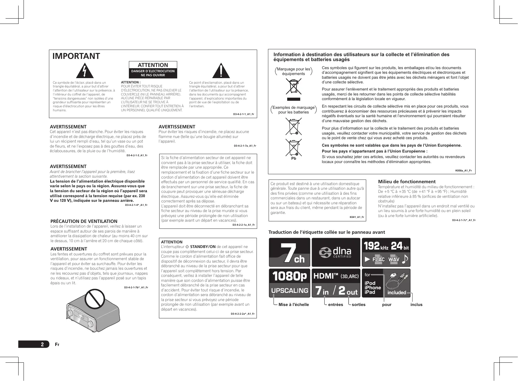 Ces symboles ne sont valables que dans les pays de l’Union Européenne. Pour les pays n’appartenant pas à l’Union Européenne : Si vous souhaitez jeter ces articles, veuillez contacter les autorités ou revendeurs locaux pour connaître les méthodes d’élimination appropriées. K058a_A1_Fr Ce produit est destiné à une utilisation domestique générale. Toute panne due à une utilisation autre qu'à des fins privées (comme une utilisation à des fins commerciales dans un restaurant, dans un autocar ou sur un bateau) et qui nécessite une réparation sera aux frais du client, même pendant la période de garantie. K041_A1_Fr Milieu de fonctionnement Température et humidité du milieu de fonctionnement : De +5 °C à +35 °C (de +41 °F à +95 °F) ; Humidité relative inférieure à 85 % (orifices de ventilation non obstrués) N’installez pas l’appareil dans un endroit mal ventilé ou un lieu soumis à une forte humidité ou en plein soleil (ou à une forte lumière artificielle). D3-4-2-1-7c*_A1_Fr D3-4-2-2-1a_A1_Fr Traduction de l’étiquette collée sur le panneau avant ATTENTION L’interrupteur STANDBY/ON de cet appareil ne coupe pas complètement celui-ci de sa prise secteur. Comme le cordon d’alimentation fait office de dispositif de déconnexion du secteur, il devra être débranché au niveau de la prise secteur pour que l’appareil soit complètement hors tension. Par conséquent, veillez à installer l’appareil de telle manière que son cordon d’alimentation puisse être facilement débranché de la prise secteur en cas d’accident. Pour éviter tout risque d’incendie, le cordon d’alimentation sera débranché au niveau de la prise secteur si vous prévoyez une période prolongée de non utilisation (par exemple avant un départ en vacances). D3-4-2-2-2a*_A1_Fr