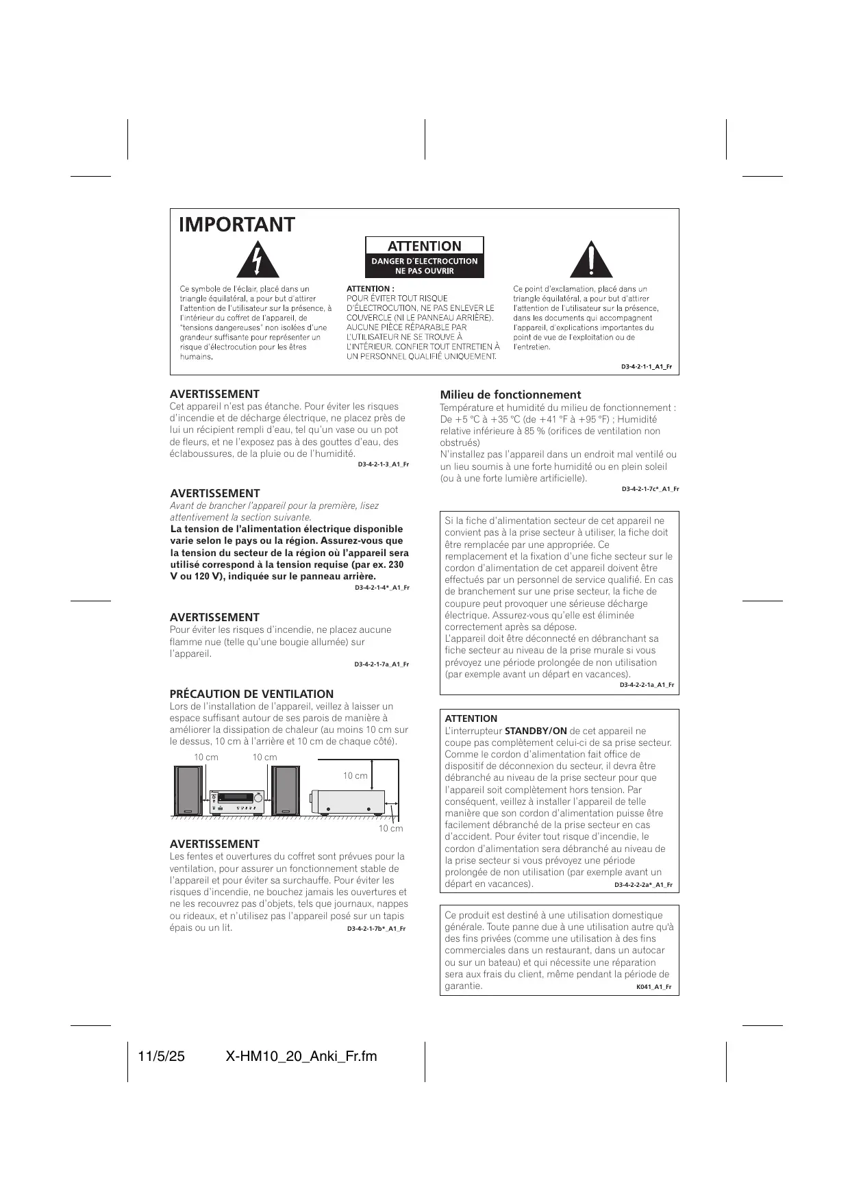 - Lors de l’installation de l’appareil, veillez à laisser un espace suffisant autour de ses parois de manière à améliorer la dissipation de chaleur (au moins 10 cm sur le dessus, 10 cm à l’arrière et 10 cm de chaque côté). 10 cm 10 cm 10 cm 10 cm AVERTISSEMENT Les fentes et ouvertures du coffret sont prévues pour la ventilation, pour assurer un fonctionnement stable de l’appareil et pour éviter sa surchauffe. Pour éviter les risques d’incendie, ne bouchez jamais les ouvertures et ne les recouvrez pas d’objets, tels que journaux, nappes ou rideaux, et n’utilisez pas l’appareil posé sur un tapis D3-4-2-1-7b*_A1_Fr épais ou un lit. 11/5/25 ATTENTION L’interrupteur STANDBY/ON de cet appareil ne coupe pas complètement celui-ci de sa prise secteur. Comme le cordon d’alimentation fait office de dispositif de déconnexion du secteur, il devra être débranché au niveau de la prise secteur pour que l’appareil soit complètement hors tension. Par conséquent, veillez à installer l’appareil de telle manière que son cordon d’alimentation puisse être facilement débranché de la prise secteur en cas d’accident. Pour éviter tout risque d’incendie, le cordon d’alimentation sera débranché au niveau de la prise secteur si vous prévoyez une période prolongée de non utilisation (par exemple avant un D3-4-2-2-2a*_A1_Fr départ en vacances). Ce produit est destiné à une utilisation domestique générale. Toute panne due à une utilisation autre qu'à des fins privées (comme une utilisation à des fins commerciales dans un restaurant, dans un autocar ou sur un bateau) et qui nécessite une réparation sera aux frais du client, même pendant la période de K041_A1_Fr garantie. Condensation Si vous transportez sans transition le lecteur d’un endroit froid dans un pièce chaude (en hiver, par exemple), ou si la température de la pièce où se trouve le lecteur augmente rapidement, des gouttelettes d’eau (condensation) peuvent se former à l’intérieur du lecteur (sur les pièces et la lentille). En cas de condensation, le lecteur ne fonctionne pas correctement et la lecture n’est pas possible. Laissez le lecteur en service pendant 1 ou 2 heures à la température ambiante (pour que l’humidité ait le temps de s’évaporer). Les gouttelettes d’eau se dissiperont et la lecture sera de nouveau possible. De la condensation peut aussi se former en été si le lecteur est exposé à l’air d’un climatiseur. Dans ce cas, éloignez le lecteur du climatiseur. S005_A1_Fr F-3 11/5/25 FRANÇAIS l Micro chaîne CD X-HM10/X-HM20, composé d'une unité principale et d'enceintes. Introduction Nous vous remercions d’avoir porté votre choix sur ce produit PIONEER. Pour en tirer le meilleur parti, veuillez lire ce mode d’emploi très attentivement. Il vous guidera dans l’utilisation de votre produit PIONEER. Note spéciale La fourniture de ce produit ne procure pas de licence et n'implique aucun droit de distribution de contenu créé avec ce produit par un système de transmission (terrestre, satellite, câble et/ou d'autres canaux de distribution) commercial, par des applications de « streaming » (par l'intermédiaire de l'internet, des intranets et/ou d'autres réseaux) commerciales, par d'autres systèmes de distribution de contenu (applications audio à la demande et similaires) commerciaux, ou sur des médias physiques (disques compacts, DVD, circuits intégrés, disques durs, cartes mémoire et similaires) engrangeant des revenus. Pour de tels usages, une license séparée est exigée. Pour les détails, veuillez visiter http:// mp3licensing.com. Technologie audio de codage MPEG Layer-3 licenciée par Fraunhofer IIS et Thomson. Accessoires Veuillez vérifier la présence des accessoires suivants. Adaptateurs iPhone x 3 (X-HM20 uniquement) Télécommande x 1 Pile « AA » x 1 Cordon d’alimentation Carte de garantie Antenne FM x 1 Ce mode d’emploi Précautions p. 5