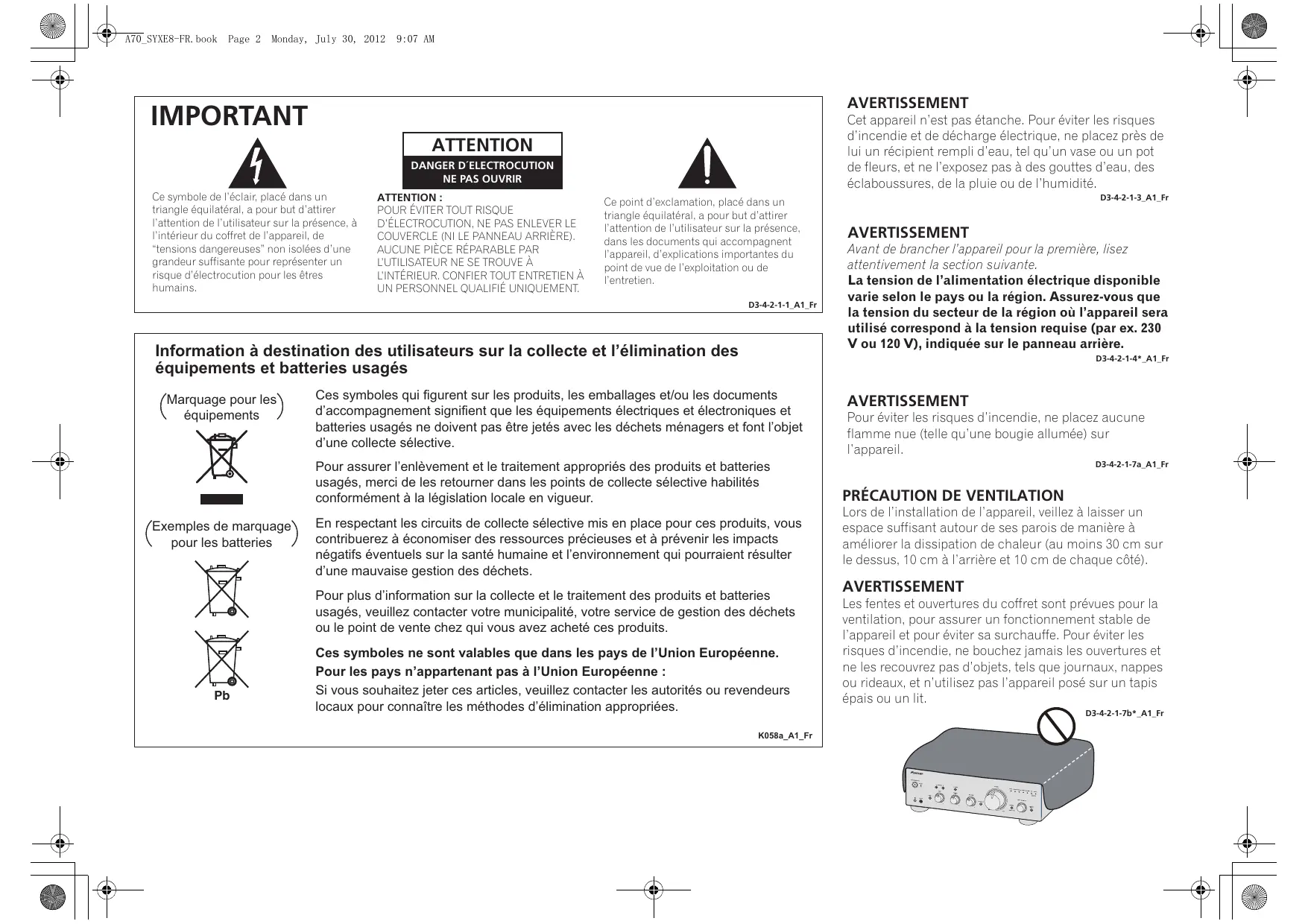- Lors de l’installation de l’appareil, veillez à laisser un espace suffisant autour de ses parois de manière à améliorer la dissipation de chaleur (au moins 30 cm sur le dessus, 10 cm à l’arrière et 10 cm de chaque côté). AVERTISSEMENT Les fentes et ouvertures du coffret sont prévues pour la ventilation, pour assurer un fonctionnement stable de l’appareil et pour éviter sa surchauffe. Pour éviter les risques d’incendie, ne bouchez jamais les ouvertures et ne les recouvrez pas d’objets, tels que journaux, nappes ou rideaux, et n’utilisez pas l’appareil posé sur un tapis épais ou un lit. D3-4-2-1-7b*_A1_Fr A70_SYXE8-FR.book Page 3 Monday, July 30, 2012 9:07 AM Milieu de fonctionnement Température et humidité du milieu de fonctionnement : De +5 °C à +35 °C (de +41 °F à +95 °F) ; Humidité relative inférieure à 85 % (orifices de ventilation non obstrués) N’installez pas l’appareil dans un endroit mal ventilé ou un lieu soumis à une forte humidité ou en plein soleil (ou à une forte lumière artificielle). Ce produit est destiné à une utilisation domestique générale. Toute panne due à une utilisation autre qu'à des fins privées (comme une utilisation à des fins commerciales dans un restaurant, dans un autocar ou sur un bateau) et qui nécessite une réparation sera aux frais du client, même pendant la période de garantie. K041_A1_Fr D3-4-2-1-7c*_A1_Fr Nous vous remercions pour cet achat d’un produit Pioneer. Nous vous demandons de lire soigneusement ce mode d’emploi ; vous serez ainsi à même de faire fonctionner l’appareil correctement. Après avoir bien lu le mode d’emploi, le ranger dans un endroit sûr pour pouvoir s’y référer ultérieurement. Table des matières 01 Préparatifs Si la fiche d’alimentation secteur de cet appareil ne convient pas à la prise secteur à utiliser, la fiche doit être remplacée par une appropriée. Ce remplacement et la fixation d’une fiche secteur sur le cordon d’alimentation de cet appareil doivent être effectués par un personnel de service qualifié. En cas de branchement sur une prise secteur, la fiche de coupure peut provoquer une sérieuse décharge électrique. Assurez-vous qu’elle est éliminée correctement après sa dépose. L’appareil doit être déconnecté en débranchant sa fiche secteur au niveau de la prise murale si vous prévoyez une période prolongée de non utilisation (par exemple avant un départ en vacances). D3-4-2-2-1a_A1_Fr ATTENTION L’interrupteur /I STANDBY/ON de cet appareil ne coupe pas complètement celui-ci de sa prise secteur. Comme le cordon d’alimentation fait office de dispositif de déconnexion du secteur, il devra être débranché au niveau de la prise secteur pour que l’appareil soit complètement hors tension. Par conséquent, veillez à installer l’appareil de telle manière que son cordon d’alimentation puisse être facilement débranché de la prise secteur en cas d’accident. Pour éviter tout risque d’incendie, le cordon d’alimentation sera débranché au niveau de la prise secteur si vous prévoyez une période prolongée de non utilisation (par exemple avant un départ en vacances). NOTE IMPORTANTE SUR LE CABLE D’ALIMENTATION Tenir le câble d’alimentation par la fiche. Ne pas débrancher la prise en tirant sur le câble et ne pas toucher le câble avec les mains mouillées. Cela risque de provoquer un court-circuit ou un choc électrique. Ne pas poser l’appareil ou un meuble sur le câble. Ne pas pincer le câble. Ne pas faire de noeud avec le câble ou l’attacher à d’autres câbles. Les câbles d’alimentation doivent être posés de façon à ne pas être écrasés. Un câble abîmé peut provoquer un risque d’incendie ou un choc électrique. Vérifier le câble d’alimentation de temps en temps. Contacter le service après-vente PIONEER le plus proche ou le revendeur pour un remplacement. S002*_A1_Fr Contenu de la boîte p. 4
