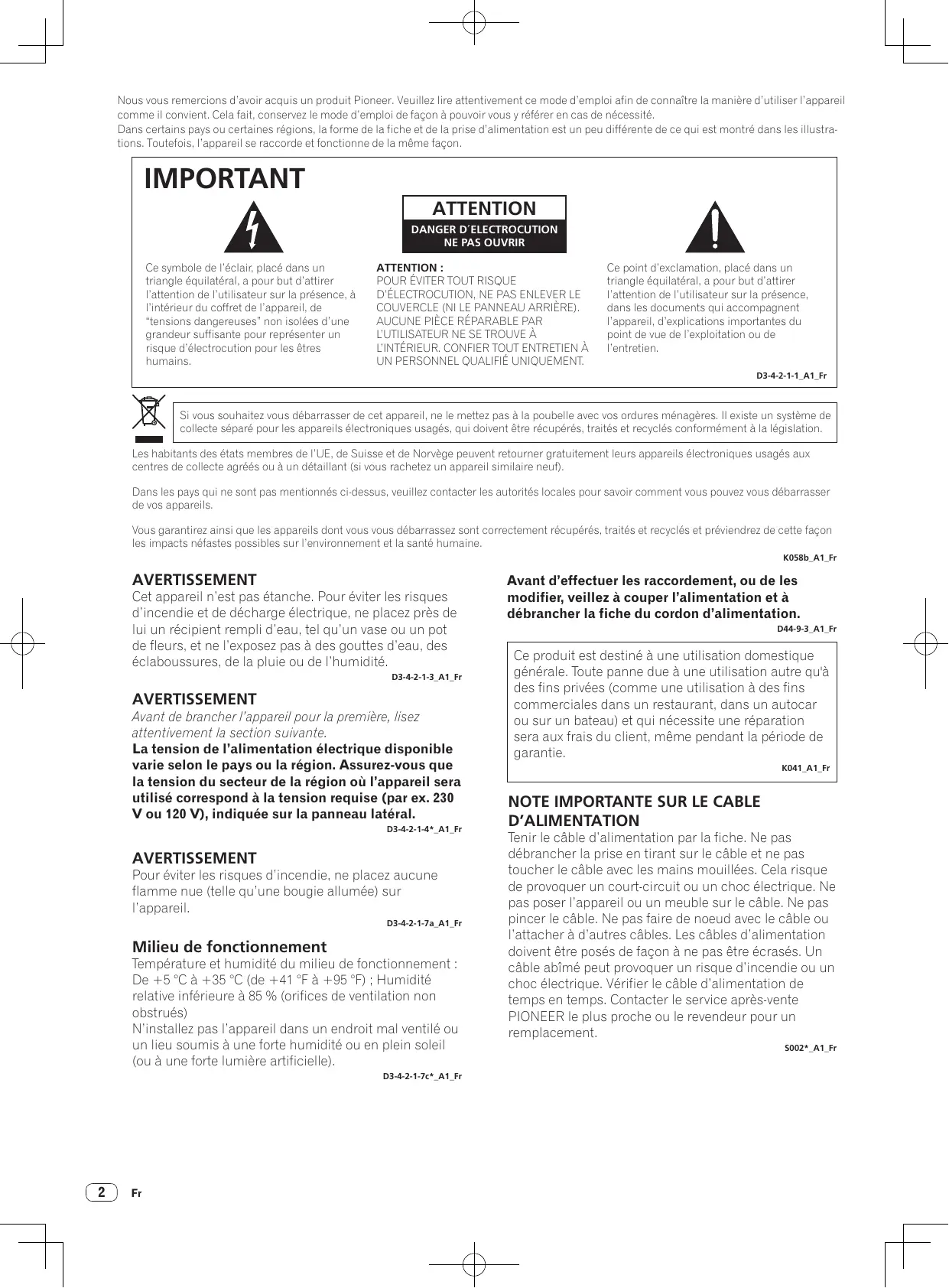 Nous vous remercions d’avoir acquis un produit Pioneer. Veuillez lire attentivement ce mode d’emploi afin de connaître la manière d’utiliser l’appareil comme il convient. Cela fait, conservez le mode d’emploi de façon à pouvoir vous y référer en cas de nécessité. Dans certains pays ou certaines régions, la forme de la fiche et de la prise d’alimentation est un peu différente de ce qui est montré dans les illustrations. Toutefois, l’appareil se raccorde et fonctionne de la même façon. IMPORTANT ATTENTION