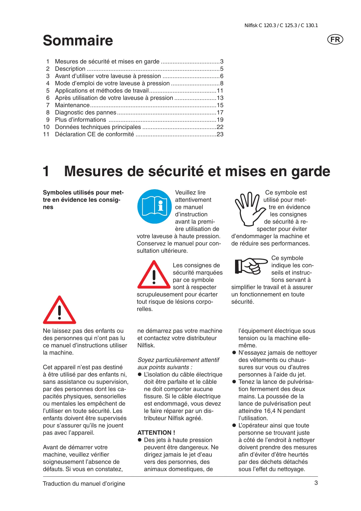 Veuillez lire attentivement ce manuel d’instruction avant la première utilisation de votre laveuse à haute pression. Conservez le manuel pour consultation ultérieure. Les consignes de sécurité marquées par ce symbole sont à respecter scrupuleusement pour écarter tout risque de lésions corporelles.
