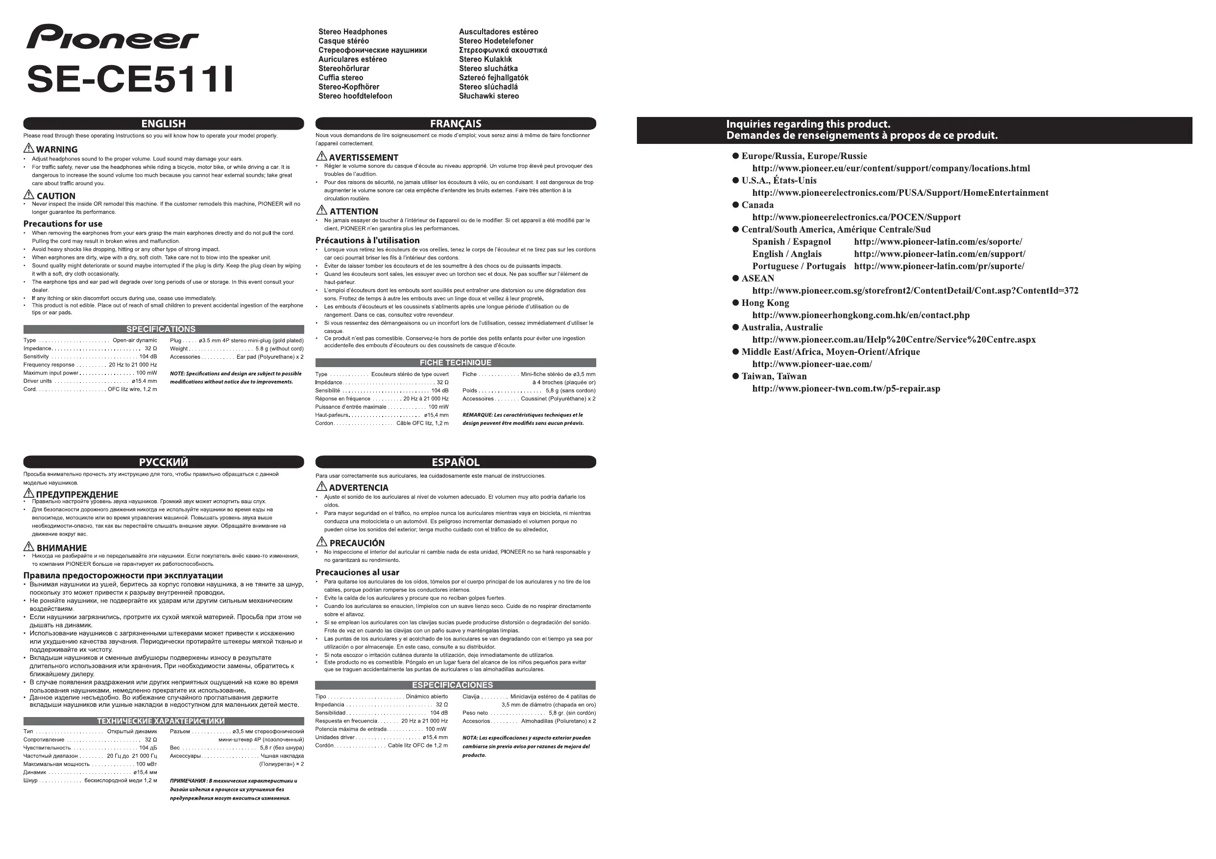 Téléchargez la notice de votre écouteurs au format PDF gratuitement ! Retrouvez votre notice SE-CE511I - PIONEER et reprennez votre appareil électronique en main. Sur cette page sont publiés tous les documents nécessaires à l'utilisation de votre appareil SE-CE511I de la marque PIONEER.
