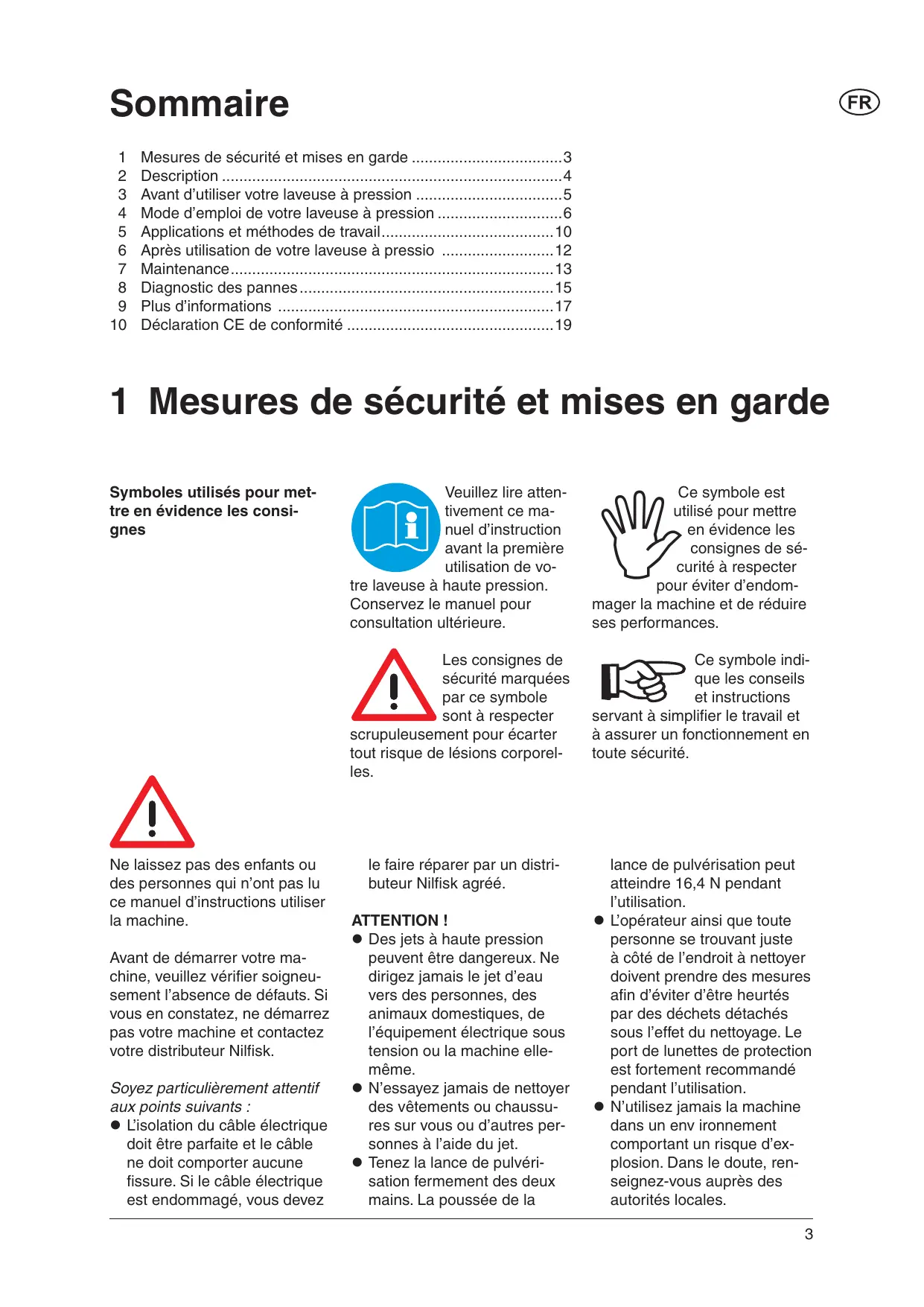 le faire réparer par un distributeur Nilfisk agréé. ATTENTION ! Des jets à haute pression peuvent être dangereux. Ne dirigez jamais le jet d’eau vers des personnes, des animaux domestiques, de l’équipement électrique sous tension ou la machine ellemême. N’essayez jamais de nettoyer des vêtements ou chaussures sur vous ou d’autres personnes à l’aide du jet. Tenez la lance de pulvérisation fermement des deux mains. La poussée de la