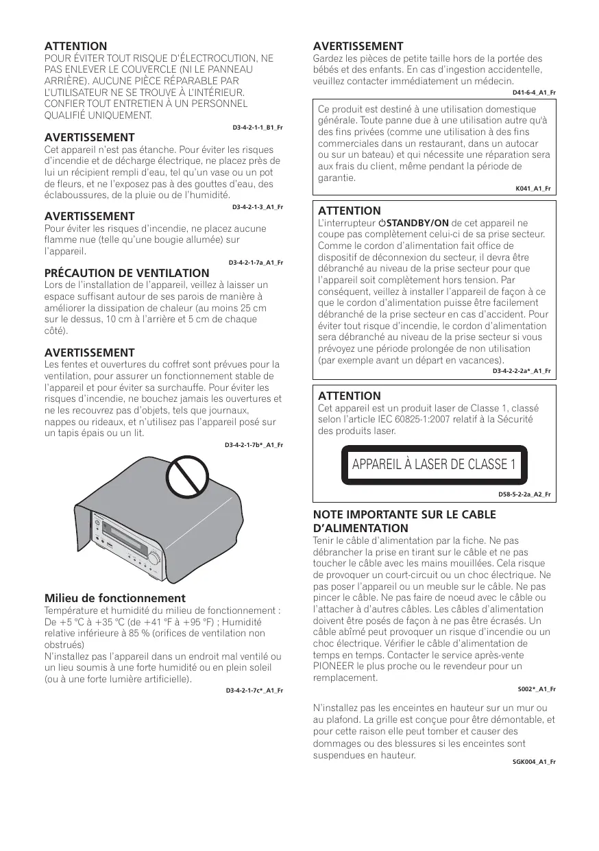 Lors de l'installation de l'appareil, veillez à laisser un espace suffisant autour de ses parois de manière à améliorer la dissipation de chaleur (au moins 25 cm sur le dessus, 10 cm à l'arrière et 5 cm de chaque côté). AVERTISSEMENT Les fentes et ouvertures du coffret sont prévues pour la ventilation, pour assurer un fonctionnement stable de l'appareil et pour éviter sa surchauffe. Pour éviter les risques d'incendie, ne bouchez jamais les ouvertures et ne les recouvrez pas d'objets, tels que journaux, nappes ou rideaux, et n'utilisez pas l'appareil posé sur un tapis épais ou un li o342- a UF 0342447 A Fr Milieu de fonctionnement Température et humidité du milieu de fonctionnement De +5 °C à +35 °C (de +41 °F à +95 °F) ; Humidité relative inférieure à 85 % (orifices de ventilation non obstrués) N'installez pas l'appareil dans un endroit mal ventilé ou un lieu soumis à une forte humidité ou en plein soleil (ou à une forte lumière artificielle). D342-476 A Fr AVERTISSEMENT Gardez les pièces de petite taille hors de la portée des bébés et des enfants. En cas d'ingestion accidentelle, veuillez contacter immédiatement un médecin. Data at Fr Ce produit est destiné à une utilisation domestique générale. Toute panne due à une utilisation autre qu'à des fins privées (comme une utilisation à des fins commerciales dans un restaurant, dans un autocar ou sur un bateau) et qui nécessite une réparation sera aux frais du client, même pendant la période de garantie. KO Ar ATTENTION L'interrupteur OSTANDBY/ON de cet appareil ne coupe pas complètement celui-ci de sa prise secteur. Comme le cordon d'alimentation fait office de dispositif de déconnexion du secteur, il devra être débranché au niveau de la prise secteur pour que l'appareil soit complètement hors tension. Par conséquent, veillez à installer l'appareil de façon à ce que le cordon d'alimentation puisse être facilement débranché de la prise secteur en cas d'accident. Pour éviter tout risque d'incendie, le cordon d'alimentation sera débranché au niveau de la prise secteur si vous prévoyez une période prolongée de non utilisation {par exemple avant un départ en vacances). D34222a A1 Fr ATTENTION Cet appareil est un produit laser de Classe 1, classé selon l'article IEC 60825-1:2007 relatif à la Sécurité des produits laser.