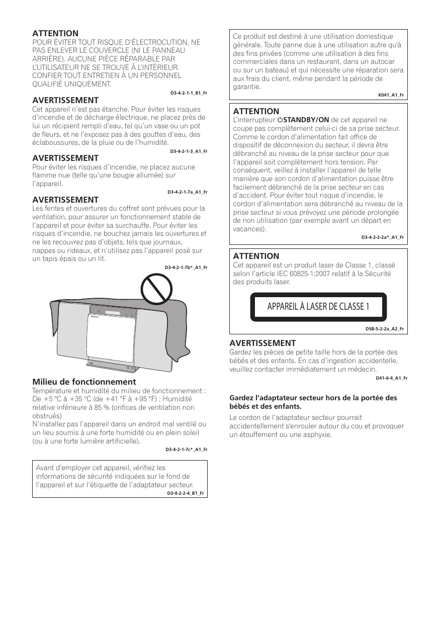 QUALIFIÉ UNIQUEMENT. Ce produit est destiné à une utilisation domestique générale. Toute panne due à une utilisation autre qu'à des fins privées (comme une utilisation à des fins commerciales dans un restaurant, dans un autocar ou sur un bateau) et qui nécessite une réparation sera aux frais du client, même pendant la période de garantie. D3-4-2-1-1_B1_Fr K041_A1_Fr AVERTISSEMENT Cet appareil n’est pas étanche. Pour éviter les risques d’incendie et de décharge électrique, ne placez près de lui un récipient rempli d’eau, tel qu’un vase ou un pot de fleurs, et ne l’exposez pas à des gouttes d’eau, des éclaboussures, de la pluie ou de l’humidité. D3-4-2-1-3_A1_Fr AVERTISSEMENT Pour éviter les risques d’incendie, ne placez aucune flamme nue (telle qu’une bougie allumée) sur l’appareil. D3-4-2-1-7a_A1_Fr AVERTISSEMENT Les fentes et ouvertures du coffret sont prévues pour la ventilation, pour assurer un fonctionnement stable de l’appareil et pour éviter sa surchauffe. Pour éviter les risques d’incendie, ne bouchez jamais les ouvertures et ne les recouvrez pas d’objets, tels que journaux, nappes ou rideaux, et n’utilisez pas l’appareil posé sur un tapis épais ou un lit. D3-4-2-1-7b*_A1_Fr ATTENTION L’interrupteur STANDBY/ON de cet appareil ne coupe pas complètement celui-ci de sa prise secteur. Comme le cordon d’alimentation fait office de dispositif de déconnexion du secteur, il devra être débranché au niveau de la prise secteur pour que l’appareil soit complètement hors tension. Par conséquent, veillez à installer l’appareil de telle manière que son cordon d’alimentation puisse être facilement débranché de la prise secteur en cas d’accident. Pour éviter tout risque d’incendie, le cordon d’alimentation sera débranché au niveau de la prise secteur si vous prévoyez une période prolongée de non utilisation (par exemple avant un départ en vacances). D3-4-2-2-2a*_A1_Fr ATTENTION Cet appareil est un produit laser de Classe 1, classé selon l’article IEC 60825-1:2007 relatif à la Sécurité des produits laser.
