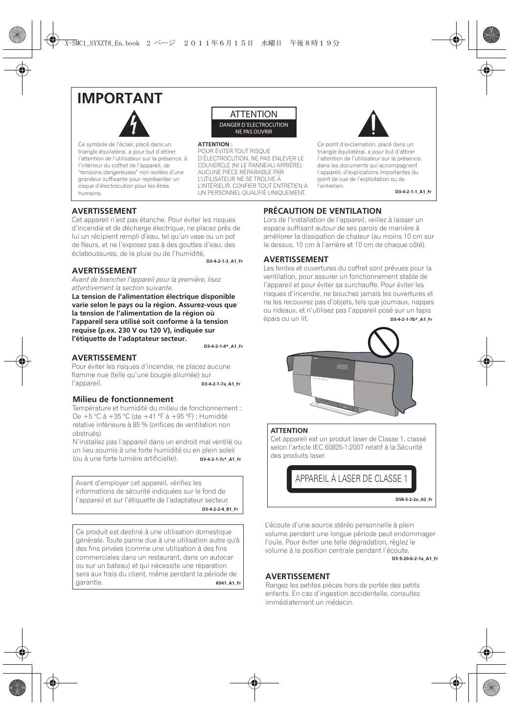 D58-5-2-2a_A2_Fr D3-4-2-2-4_B1_Fr Ce produit est destiné à une utilisation domestique générale. Toute panne due à une utilisation autre qu'à des fins privées (comme une utilisation à des fins commerciales dans un restaurant, dans un autocar ou sur un bateau) et qui nécessite une réparation sera aux frais du client, même pendant la période de K041_A1_Fr garantie. L’écoute d’une source stéréo personnelle à plein volume pendant une longue période peut endommager l’ouïe. Pour éviter une telle dégradation, réglez le volume à la position centrale pendant l’écoute. D3-5-20-6-2-1a_A1_Fr AVERTISSEMENT Rangez les petites pièces hors de portée des petits enfants. En cas d’ingestion accidentelle, consultez immédiatement un médecin. X-SMC1_SYXZT8_En.book 3 ページ