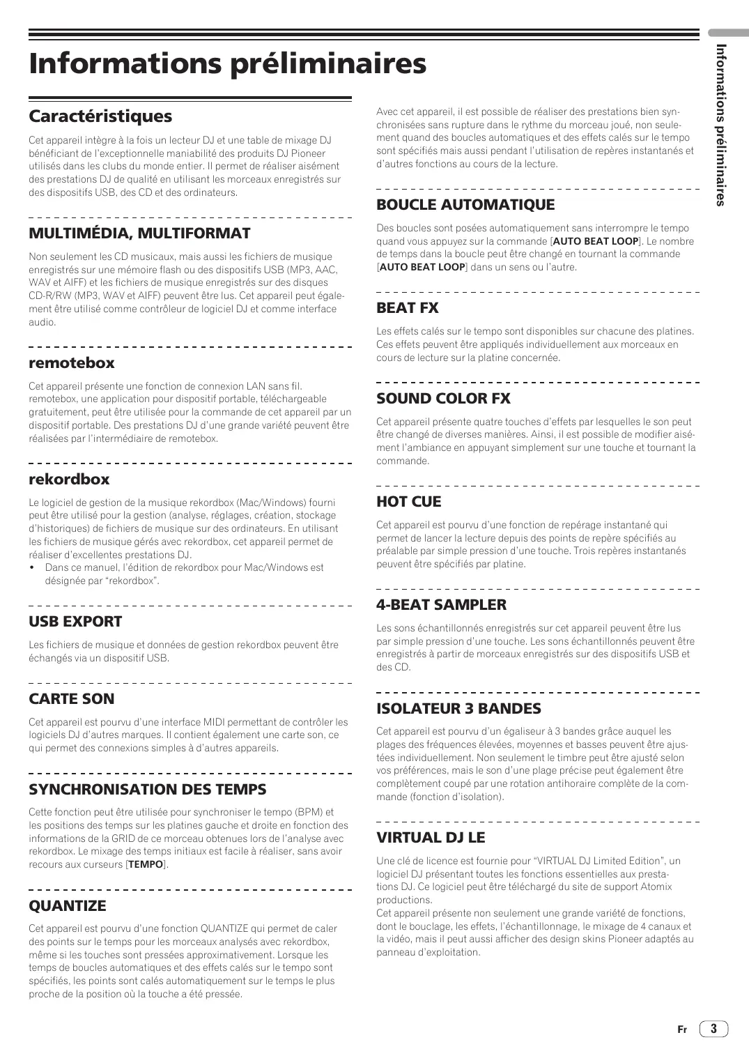 Cette fonction peut être utilisée pour synchroniser le tempo (BPM) et les positions des temps sur les platines gauche et droite en fonction des informations de la GRID de ce morceau obtenues lors de l’analyse avec rekordbox. Le mixage des temps initiaux est facile à réaliser, sans avoir recours aux curseurs [TEMPO]. QUANTIZE Cet appareil est pourvu d’une fonction QUANTIZE qui permet de caler des points sur le temps pour les morceaux analysés avec rekordbox, même si les touches sont pressées approximativement. Lorsque les temps de boucles automatiques et des effets calés sur le tempo sont spécifiés, les points sont calés automatiquement sur le temps le plus proche de la position où la touche a été pressée. HOT CUE Cet appareil est pourvu d’une fonction de repérage instantané qui permet de lancer la lecture depuis des points de repère spécifiés au préalable par simple pression d’une touche. Trois repères instantanés peuvent être spécifiés par platine. 4-BEAT SAMPLER Les sons échantillonnés enregistrés sur cet appareil peuvent être lus par simple pression d’une touche. Les sons échantillonnés peuvent être enregistrés à partir de morceaux enregistrés sur des dispositifs USB et des CD. ISOLATEUR 3 BANDES Cet appareil est pourvu d’un égaliseur à 3 bandes grâce auquel les plages des fréquences élevées, moyennes et basses peuvent être ajustées individuellement. Non seulement le timbre peut être ajusté selon vos préférences, mais le son d’une plage précise peut également être complètement coupé par une rotation antihoraire complète de la commande (fonction d’isolation).