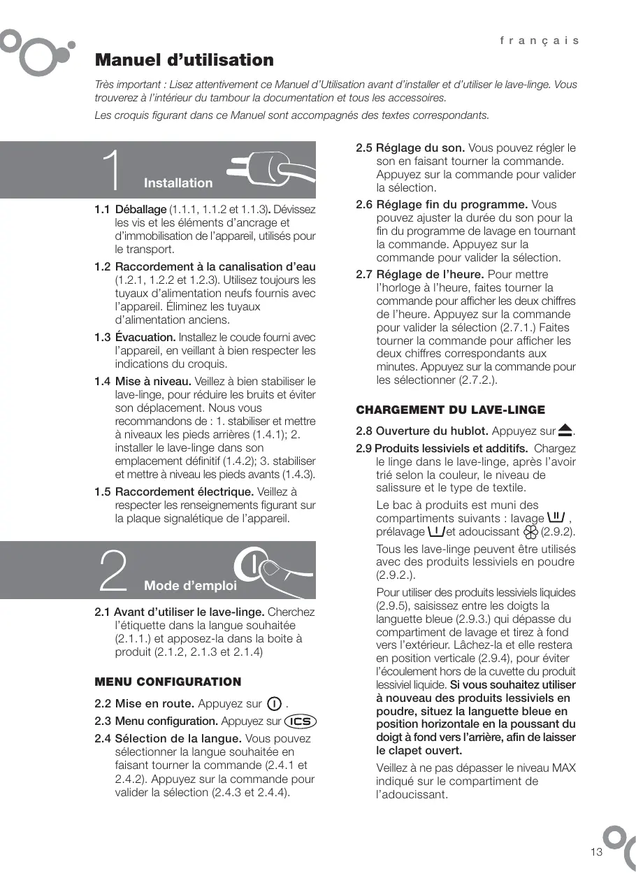 | Utilisation détergent liquide | Compartiment spécifique avec dispositif anti-fuite |