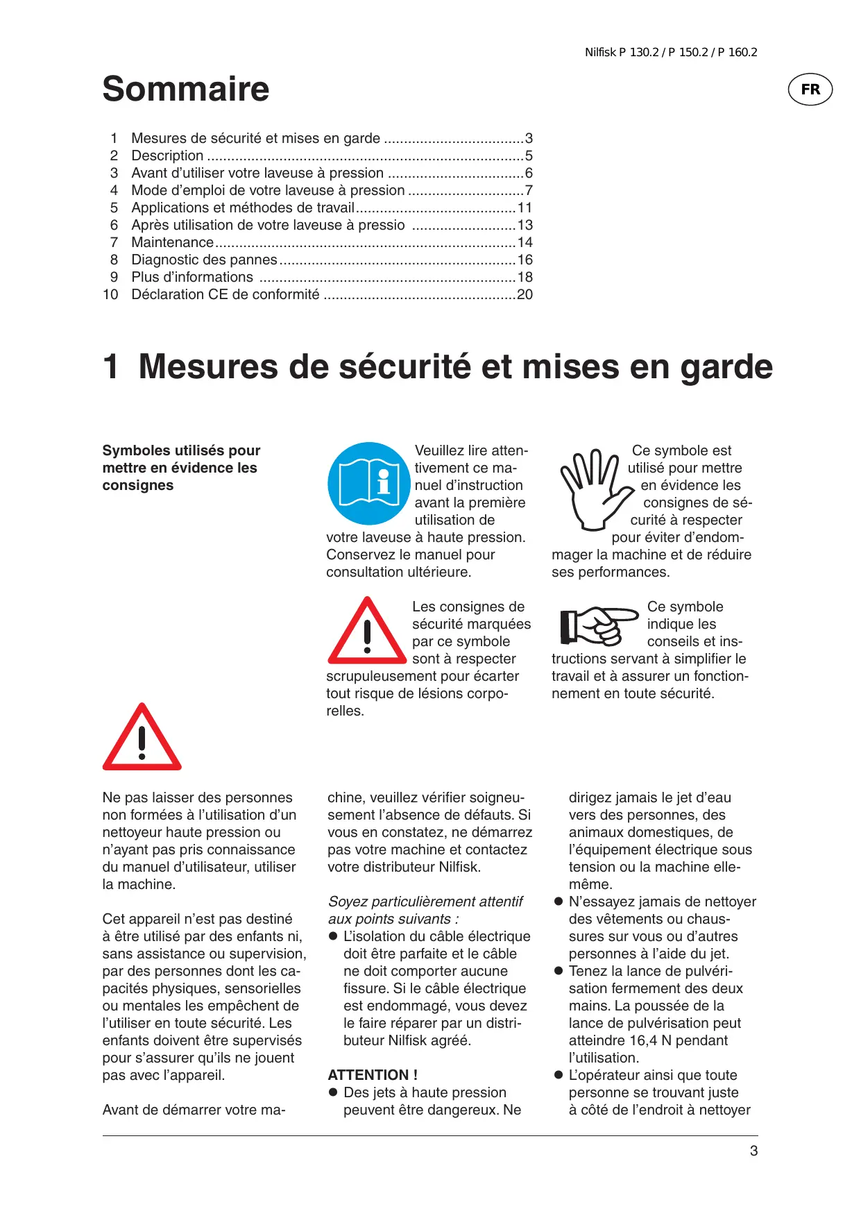 Veuillez lire attentivement ce manuel d’instruction avant la première utilisation de votre laveuse à haute pression. Conservez le manuel pour consultation ultérieure. Ce symbole est utilisé pour mettre en évidence les consignes de sécurité à respecter pour éviter d’endommager la machine et de réduire ses performances. Les consignes de sécurité marquées par ce symbole sont à respecter scrupuleusement pour écarter tout risque de lésions corporelles. Ce symbole indique les conseils et instructions servant à simplifier le travail et à assurer un fonctionnement en toute sécurité. chine, veuillez vérifier soigneusement l’absence de défauts. Si vous en constatez, ne démarrez pas votre machine et contactez votre distributeur Nilfisk. dirigez jamais le jet d’eau vers des personnes, des animaux domestiques, de l’équipement électrique sous tension ou la machine ellemême. N’essayez jamais de nettoyer des vêtements ou chaussures sur vous ou d’autres personnes à l’aide du jet. Tenez la lance de pulvérisation fermement des deux mains. La poussée de la lance de pulvérisation peut atteindre 16,4 N pendant l’utilisation. L’opérateur ainsi que toute personne se trouvant juste à côté de l’endroit à nettoyer Soyez particulièrement attentif aux points suivants : L’isolation du câble électrique doit être parfaite et le câble ne doit comporter aucune fissure. Si le câble électrique est endommagé, vous devez le faire réparer par un distributeur Nilfisk agréé. ATTENTION ! Des jets à haute pression peuvent être dangereux. Ne
