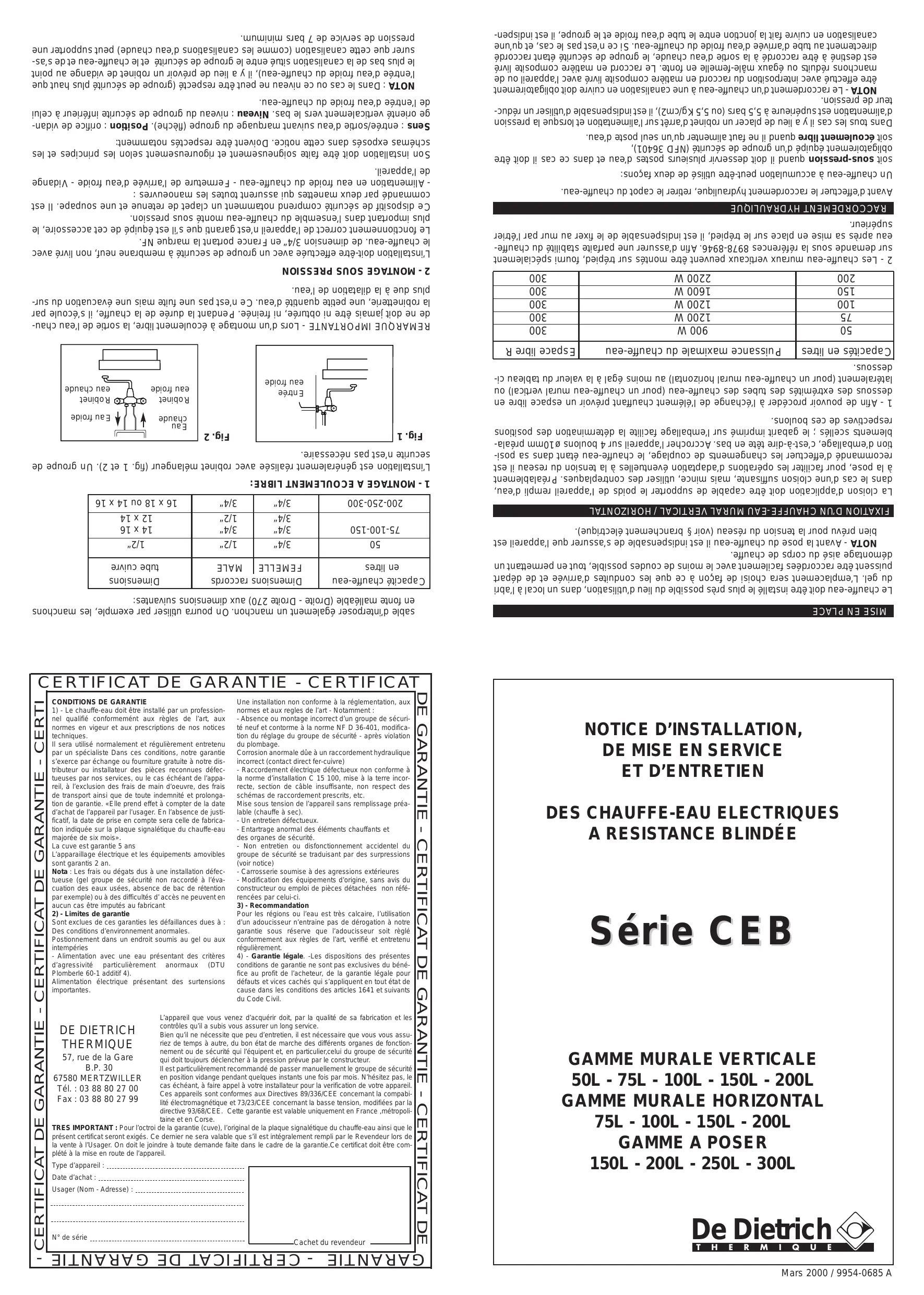 conditions de garantie ne sont pas exclusives du bénéfice au profit de l’acheteur, de la garantie légale pour défauts et vices cachés qui s’appliquent en tout état de cause dans les conditions des articles 1641 et suivants du Code Civil. DE GARANTIE - CERTIFICAT DE GARANTIE - CERTIFICAT DE N° de série Usager (Nom - Adresse) : Date d’achat : Type d’appareil : L’appareil que vous venez d’acquérir doit, par la qualité de sa fabrication et les contrôles qu’il a subis vous assurer un long service. Bien qu’il ne nécessite que peu d’entretien, il est nécessaire que vous vous assuriez de temps à autre, du bon état de marche des différents organes de fonctionnement ou de sécurité qui l’équipent et, en particulier,celui du groupe de sécurité 57, rue de la Gare qui doit toujours déclencher à la pression prévue par le constructeur. B.P. 30 Il est particulièrement recommandé de passer manuellement le groupe de sécurité en position vidange pendant quelques instants une fois par mois. N’hésitez pas, le 67580 MERTZWILLER cas échéant, à faire appel à votre installateur pour la verification de votre appareil. Tél. : 03 88 80 27 00 Ces appareils sont conformes aux Directives 89/336/CEE concernant la compabiFax : 03 88 80 27 99 lité électromagnétique et 73/23/CEE concernant la basse tension, modifiées par la directive 93/68/CEE. Cette garantie est valable uniquement en France ,métropolitaine et en Corse. TRES IMPORTANT : Pour l’octroi de la garantie (cuve), I’original de la plaque signalétique du chauffe-eau ainsi que le présent certificat seront exigés. Ce dernier ne sera valable que s’il est intégralement rempli par le Revendeur lors de la vente à l’Usager. On doit le joindre à toute demande faite dans le cadre de la garantie.Ce certificat doit être complété à la mise en route de l’appareil. DE DIETRICH THERMIQUE CONDITIONS DE GARANTlE