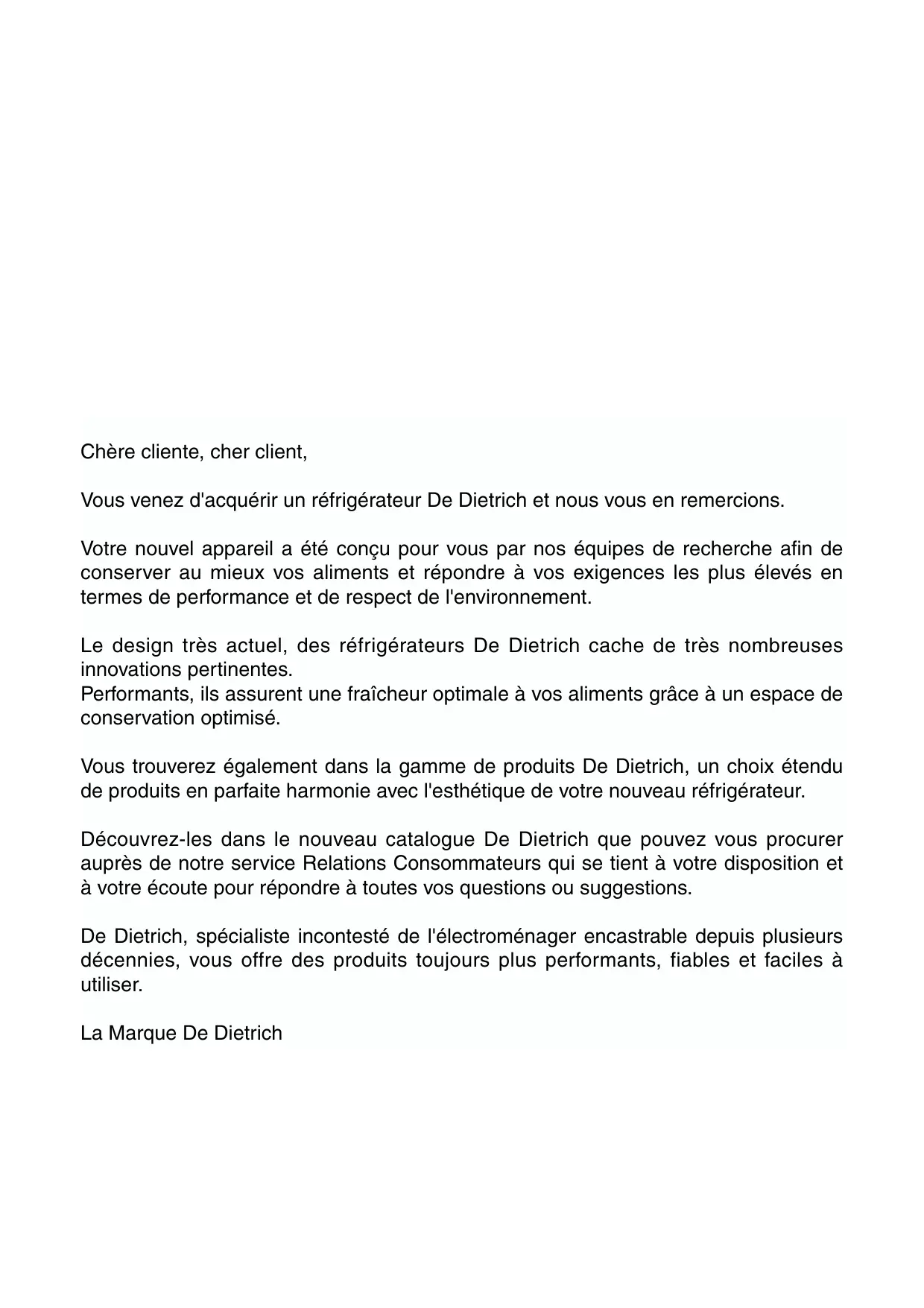 Voues venez d'acquérir un réfrigérateur De Dietrich et nous vous en remercions.