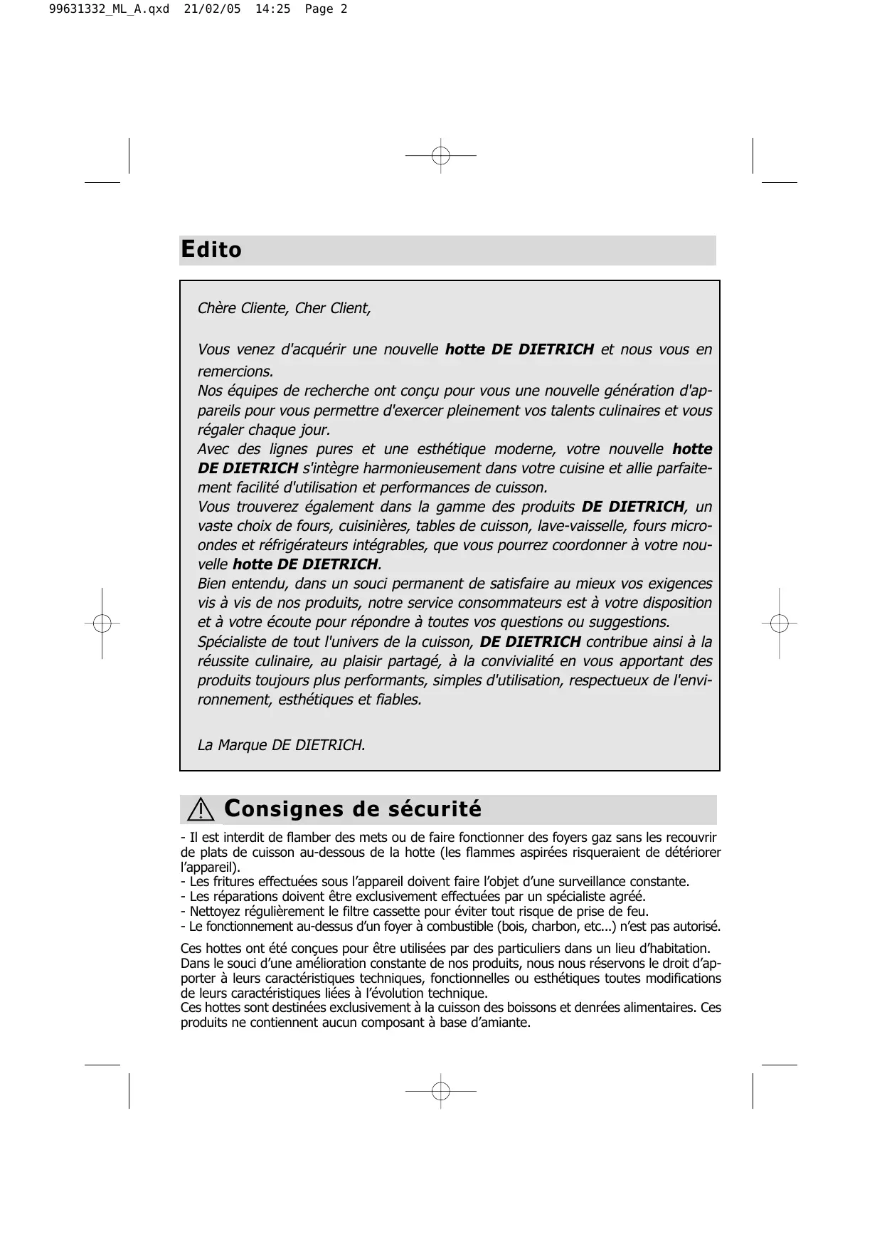 Vous venez d'acquerir une nouvelle hotte DE DIETRICH et nous vous en remercions.