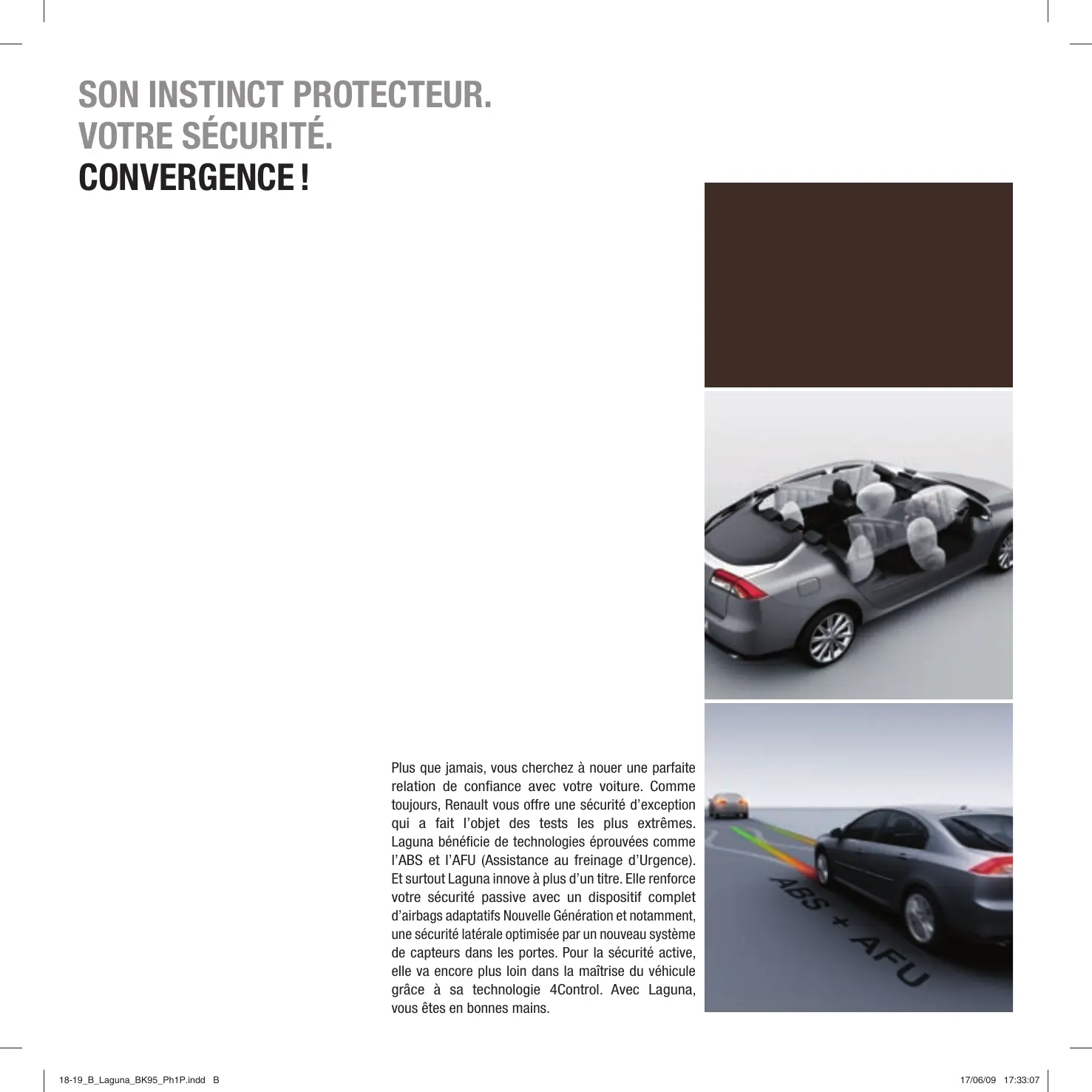 - Les sièges sont entièrement revêtus de cuir pour les faces avant de l’assise, du dossier, des appuis-tête et des renforts latéraux. 16-17_B_Laguna_BK95_Ph1P.indd 17 24/06/09 17:53:53 18 > 19 18-19_B_Laguna_BK95_Ph1P.indd A 17/06/09 17:32:58 SON INSTINCT PROTECTEUR. VOTRE SÉCURITÉ. CONVERGENCE ! Plus que jamais, vous cherchez à nouer une parfaite relation de confiance avec votre voiture. Comme toujours, Renault vous offre une sécurité d’exception qui a fait l’objet des tests les plus extrêmes. Laguna bénéficie de technologies éprouvées comme l’ABS et l’AFU (Assistance au freinage d’Urgence). Et surtout Laguna innove à plus d’un titre. Elle renforce votre sécurité passive avec un dispositif complet d’airbags adaptatifs Nouvelle Génération et notamment, une sécurité latérale optimisée par un nouveau système de capteurs dans les portes. Pour la sécurité active, elle va encore plus loin dans la maîtrise du véhicule grâce à sa technologie 4Control. Avec Laguna, vous êtes en bonnes mains. 18-19_B_Laguna_BK95_Ph1P.indd B 17/06/09 17:33:07