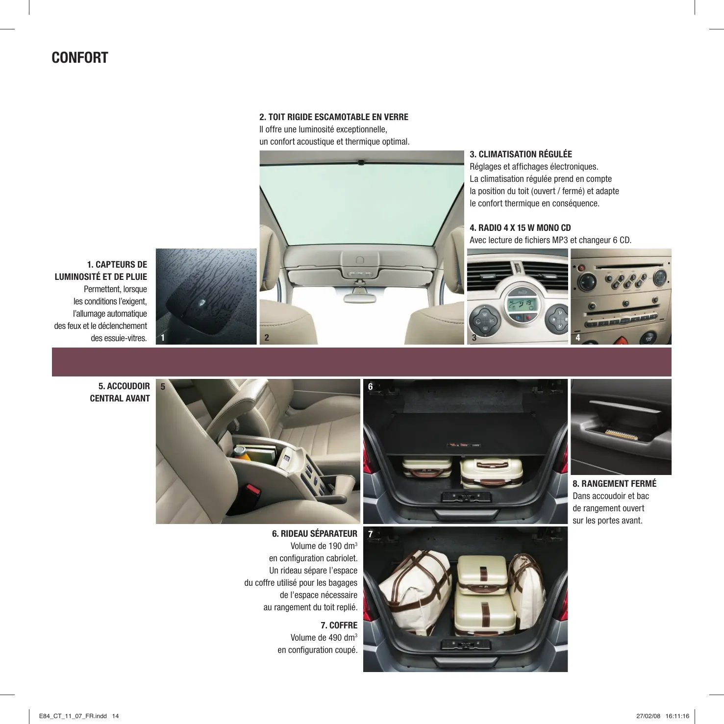 27/02/08 16:12:01 RANGEMENTS Boîte à gants (17 litres) éclairée et rafraîchie (si climatisation) Emplacement porte-gobelets sur console centrale avant Rangement central fermé sous accoudoir avant Rangements fermés sous accoudoirs de portes avant Vide-poches de portes avant intégrant porte-gobelets COMMUNICATION Radio 4 x 15 W mono CD, RDS, satellite de commandes au volant Radio 4 x 15 W mono CD avec lecture MP3, RDS, satellite de commandes au volant Radio 4 x 15 W mono CD et changeur 6 CD sur planche de bord, RDS, satellite de commandes au volant Radio 4 x 15 W mono CD avec lecture MP3 et changeur 6 CD sur planche de bord, RDS, satellite de commandes au volant Radio 4 x 30 W Cabasse mono CD avec lecture MP3 et changeur 6 CD sur planche de bord, RDS, satellite de commandes au volant Carminat Navigation Informée 2 : système de guidage par GPS et Info trafic, cartographie couleur, écran 16/9e escamotable, intégrant radio 4 x 15 W mono CD, RDS, satellite de commandes au volant Carminat Navigation Informée 2 : système de guidage par GPS et Info trafic, cartographie couleur, écran 16/9e escamotable, intégrant radio 4 x 15 W mono CD et changeur CD sur planche de bord, RDS, satellite de commandes au volant Carminat Navigation Informée 2 : système de guidage par GPS et Info trafic, cartographie couleur, écran 16/9e escamotable, intégrant Radio 4 x 40 W Cabasse avec changeur 6 CD intégré, RDS, satellite de commandes au volant Commande mains-libres de téléphone Bluetooth® (4) Audio Connection Box