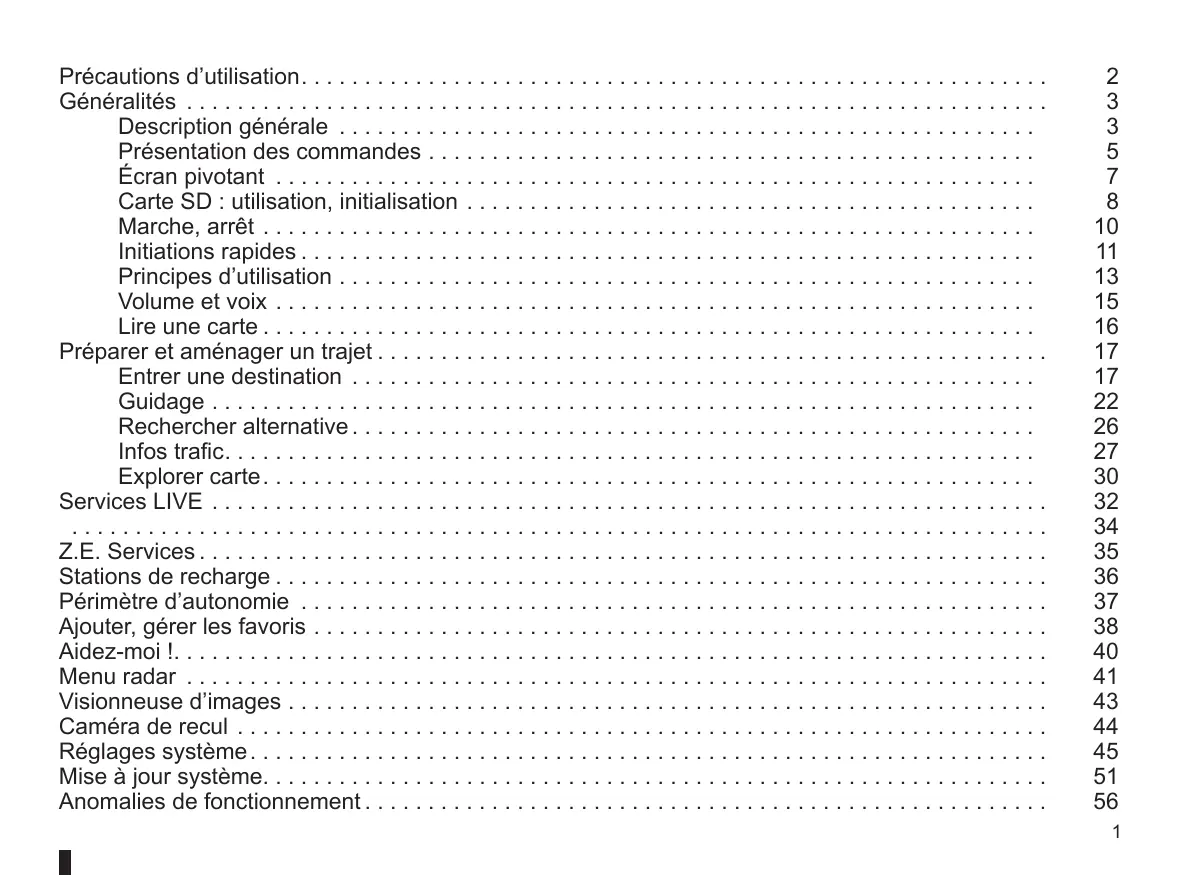 Précautions d’utilisation. . . . . . . . . . . . . . . . . . . . . . . . . . . . . . . . . . . . . . . . . . . . . . . . . . . . . . . . . . . Généralités . . . . . . . . . . . . . . . . . . . . . . . . . . . . . . . . . . . . . . . . . . . . . . . . . . . . . . . . . . . . . . . . . . . . Description générale . . . . . . . . . . . . . . . . . . . . . . . . . . . . . . . . . . . . . . . . . . . . . . . . . . . . . . . Présentation des commandes. . . . . . . . . . . . . . . . . . . . . . . . . . . . . . . . . . . . . . . . . . . . . . . . Écran pivotant . . . . . . . . . . . . . . . . . . . . . . . . . . . . . . . . . . . . . . . . . . . . . . . . . . . . . . . . . . . . Carte SD : utilisation, initialisation. . . . . . . . . . . . . . . . . . . . . . . . . . . . . . . . . . . . . . . . . . . . . Marche, arrêt. . . . . . . . . . . . . . . . . . . . . . . . . . . . . . . . . . . . . . . . . . . . . . . . . . . . . . . . . . . . . Initiations rapides. . . . . . . . . . . . . . . . . . . . . . . . . . . . . . . . . . . . . . . . . . . . . . . . . . . . . . . . . . Principes d’utilisation. . . . . . . . . . . . . . . . . . . . . . . . . . . . . . . . . . . . . . . . . . . . . . . . . . . . . . . Volume et voix. . . . . . . . . . . . . . . . . . . . . . . . . . . . . . . . . . . . . . . . . . . . . . . . . . . . . . . . . . . . Lire une carte. . . . . . . . . . . . . . . . . . . . . . . . . . . . . . . . . . . . . . . . . . . . . . . . . . . . . . . . . . . . . Préparer et aménager un trajet. . . . . . . . . . . . . . . . . . . . . . . . . . . . . . . . . . . . . . . . . . . . . . . . . . . . . Entrer une destination . . . . . . . . . . . . . . . . . . . . . . . . . . . . . . . . . . . . . . . . . . . . . . . . . . . . . . Guidage. . . . . . . . . . . . . . . . . . . . . . . . . . . . . . . . . . . . . . . . . . . . . . . . . . . . . . . . . . . . . . . . . Rechercher alternative. . . . . . . . . . . . . . . . . . . . . . . . . . . . . . . . . . . . . . . . . . . . . . . . . . . . . . Infos trafic. . . . . . . . . . . . . . . . . . . . . . . . . . . . . . . . . . . . . . . . . . . . . . . . . . . . . . . . . . . . . . . . Explorer carte. . . . . . . . . . . . . . . . . . . . . . . . . . . . . . . . . . . . . . . . . . . . . . . . . . . . . . . . . . . . . Services LIVE . . . . . . . . . . . . . . . . . . . . . . . . . . . . . . . . . . . . . . . . . . . . . . . . . . . . . . . . . . . . . . . . . . Z.E. Services. . . . . . . . . . . . . . . . . . . . . . . . . . . . . . . . . . . . . . . . . . . . . . . . . . . . . . . . . . . . . . . . . . . Stations de recharge. . . . . . . . . . . . . . . . . . . . . . . . . . . . . . . . . . . . . . . . . . . . . . . . . . . . . . . . . . . . . Périmètre d’autonomie . . . . . . . . . . . . . . . . . . . . . . . . . . . . . . . . . . . . . . . . . . . . . . . . . . . . . . . . . . . Ajouter, gérer les favoris. . . . . . . . . . . . . . . . . . . . . . . . . . . . . . . . . . . . . . . . . . . . . . . . . . . . . . . . . . Aidez-moi !. . . . . . . . . . . . . . . . . . . . . . . . . . . . . . . . . . . . . . . . . . . . . . . . . . . . . . . . . . . . . . . . . . . . . Menu radar . . . . . . . . . . . . . . . . . . . . . . . . . . . . . . . . . . . . . . . . . . . . . . . . . . . . . . . . . . . . . . . . . . . . Visionneuse d’images. . . . . . . . . . . . . . . . . . . . . . . . . . . . . . . . . . . . . . . . . . . . . . . . . . . . . . . . . . . . Caméra de recul . . . . . . . . . . . . . . . . . . . . . . . . . . . . . . . . . . . . . . . . . . . . . . . . . . . . . . . . . . . . . . . . Réglages système. . . . . . . . . . . . . . . . . . . . . . . . . . . . . . . . . . . . . . . . . . . . . . . . . . . . . . . . . . . . . . . Mise à jour système. . . . . . . . . . . . . . . . . . . . . . . . . . . . . . . . . . . . . . . . . . . . . . . . . . . . . . . . . . . . . . Anomalies de fonctionnement. . . . . . . . . . . . . . . . . . . . . . . . . . . . . . . . . . . . . . . . . . . . . . . . . . . . . .