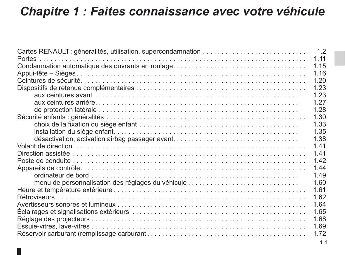 Cartes RENAULT : généralités, utilisation, supercondamnation. . . . . . . . . . . . . . . . . . . . . . . . . . . . Portes . . . . . . . . . . . . . . . . . . . . . . . . . . . . . . . . . . . . . . . . . . . . . . . . . . . . . . . . . . . . . . . . . . . . . . . . Condamnation automatique des ouvrants en roulage. . . . . . . . . . . . . . . . . . . . . . . . . . . . . . . . . . . . Appui-tête – Sièges. . . . . . . . . . . . . . . . . . . . . . . . . . . . . . . . . . . . . . . . . . . . . . . . . . . . . . . . . . . . . . Ceintures de sécurité. . . . . . . . . . . . . . . . . . . . . . . . . . . . . . . . . . . . . . . . . . . . . . . . . . . . . . . . . . . . . Dispositifs de retenue complémentaires :. . . . . . . . . . . . . . . . . . . . . . . . . . . . . . . . . . . . . . . . . . . . . aux ceintures avant . . . . . . . . . . . . . . . . . . . . . . . . . . . . . . . . . . . . . . . . . . . . . . . . . . . . . . . . aux ceintures arrière. . . . . . . . . . . . . . . . . . . . . . . . . . . . . . . . . . . . . . . . . . . . . . . . . . . . . . . . de protection latérale. . . . . . . . . . . . . . . . . . . . . . . . . . . . . . . . . . . . . . . . . . . . . . . . . . . . . . . Sécurité enfants : généralités . . . . . . . . . . . . . . . . . . . . . . . . . . . . . . . . . . . . . . . . . . . . . . . . . . . . . . choix de la fixation du siège enfant . . . . . . . . . . . . . . . . . . . . . . . . . . . . . . . . . . . . . . . . . . . . installation du siège enfant. . . . . . . . . . . . . . . . . . . . . . . . . . . . . . . . . . . . . . . . . . . . . . . . . . . désactivation, activation airbag passager avant. . . . . . . . . . . . . . . . . . . . . . . . . . . . . . . . . . . Volant de direction. . . . . . . . . . . . . . . . . . . . . . . . . . . . . . . . . . . . . . . . . . . . . . . . . . . . . . . . . . . . . . . Direction assistée . . . . . . . . . . . . . . . . . . . . . . . . . . . . . . . . . . . . . . . . . . . . . . . . . . . . . . . . . . . . . . . Poste de conduite. . . . . . . . . . . . . . . . . . . . . . . . . . . . . . . . . . . . . . . . . . . . . . . . . . . . . . . . . . . . . . . Appareils de contrôle. . . . . . . . . . . . . . . . . . . . . . . . . . . . . . . . . . . . . . . . . . . . . . . . . . . . . . . . . . . . . ordinateur de bord . . . . . . . . . . . . . . . . . . . . . . . . . . . . . . . . . . . . . . . . . . . . . . . . . . . . . . . . . menu de personnalisation des réglages du véhicule. . . . . . . . . . . . . . . . . . . . . . . . . . . . . . . Heure et température extérieure. . . . . . . . . . . . . . . . . . . . . . . . . . . . . . . . . . . . . . . . . . . . . . . . . . . . Rétroviseurs . . . . . . . . . . . . . . . . . . . . . . . . . . . . . . . . . . . . . . . . . . . . . . . . . . . . . . . . . . . . . . . . . . . Avertisseurs sonores et lumineux. . . . . . . . . . . . . . . . . . . . . . . . . . . . . . . . . . . . . . . . . . . . . . . . . . . Éclairages et signalisations extérieurs . . . . . . . . . . . . . . . . . . . . . . . . . . . . . . . . . . . . . . . . . . . . . . . Réglage des projecteurs. . . . . . . . . . . . . . . . . . . . . . . . . . . . . . . . . . . . . . . . . . . . . . . . . . . . . . . . . . Essuie-vitres, lave-vitres. . . . . . . . . . . . . . . . . . . . . . . . . . . . . . . . . . . . . . . . . . . . . . . . . . . . . . . . . . Réservoir carburant (remplissage carburant. . . . . . . . . . . . . . . . . . . . . . . . . . . . . . . . . . . . . . . . . . .