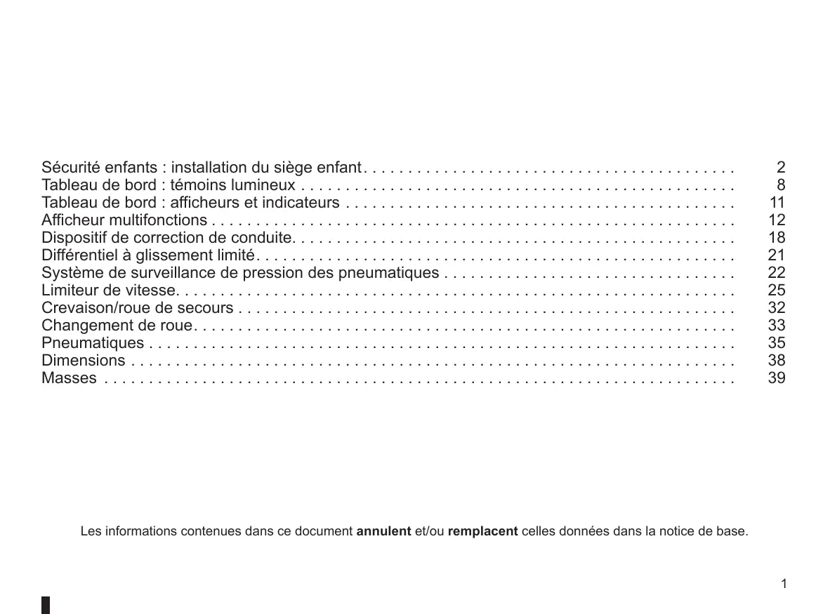 Sécurité enfants : installation du siège enfant. ........................... Tableau de bord : témoins lumineux . ...... Tableau de bord : afficheurs et indicateurs . Afficheur multifonctions ................. Dispositif de correction de conduite. Différentiel à glissement limité Système de surveillance de pression des pneumatiques . Limiteur de vitesse. ............................... Crevaison/roue de secours Changement de roue. .... Pneumatiques . . Dimensions . Masses ......................................................... Les informations contenues dans ce document annulent et/ou remplacent celles données dans la notice de base.