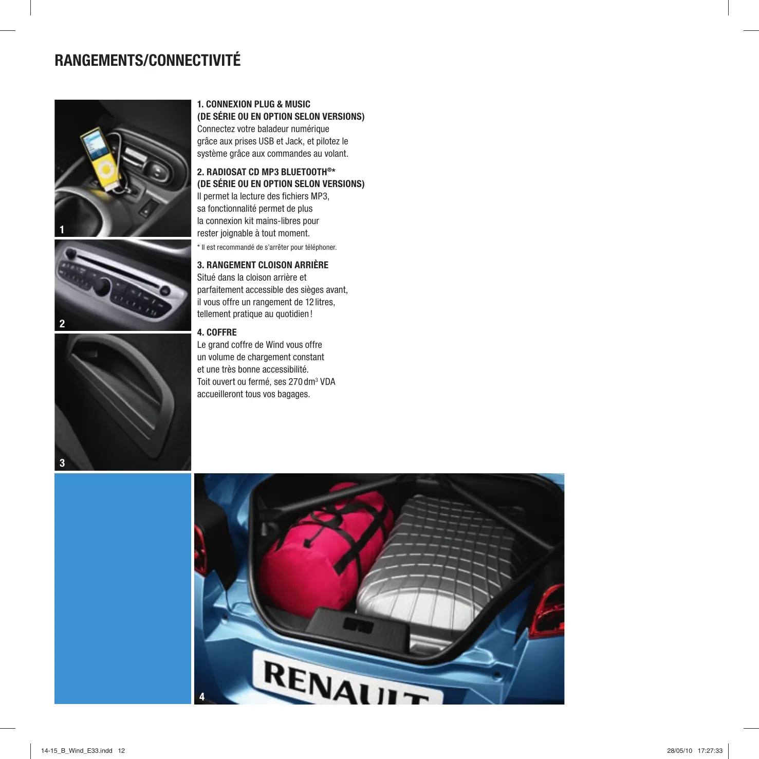 Le grand coffre de Wind vous offre un volume de chargement constant et une très bonne accessibilité. Toit ouvert ou fermé, ses 270 dm* VDA accueilleront tous vos bagages. 1415_B_Wind E33.ndd 12 28/05/10 17:27:33