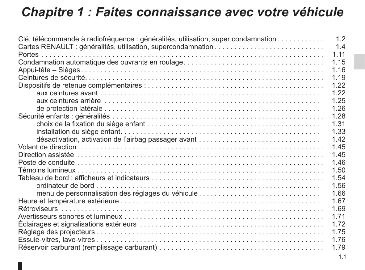 Chapitre 1 : Faites connaissance avec votre véhicule Clé, télécommande à radiofréquence : généralités, utilisation, super condamnation. . . . . . . . . . . . Cartes RENAULT : généralités, utilisation, supercondamnation. . . . . . . . . . . . . . . . . . . . . . . . . . . . Portes . . . . . . . . . . . . . . . . . . . . . . . . . . . . . . . . . . . . . . . . . . . . . . . . . . . . . . . . . . . . . . . . . . . . . . . . Condamnation automatique des ouvrants en roulage. . . . . . . . . . . . . . . . . . . . . . . . . . . . . . . . . . . . Appui-tête – Sièges. . . . . . . . . . . . . . . . . . . . . . . . . . . . . . . . . . . . . . . . . . . . . . . . . . . . . . . . . . . . . . Ceintures de sécurité. . . . . . . . . . . . . . . . . . . . . . . . . . . . . . . . . . . . . . . . . . . . . . . . . . . . . . . . . . . . . Dispositifs de retenue complémentaires :. . . . . . . . . . . . . . . . . . . . . . . . . . . . . . . . . . . . . . . . . . . . . aux ceintures avant . . . . . . . . . . . . . . . . . . . . . . . . . . . . . . . . . . . . . . . . . . . . . . . . . . . . . . . . aux ceintures arrière . . . . . . . . . . . . . . . . . . . . . . . . . . . . . . . . . . . . . . . . . . . . . . . . . . . . . . . de protection latérale. . . . . . . . . . . . . . . . . . . . . . . . . . . . . . . . . . . . . . . . . . . . . . . . . . . . . . . Sécurité enfants : généralités . . . . . . . . . . . . . . . . . . . . . . . . . . . . . . . . . . . . . . . . . . . . . . . . . . . . . . choix de la fixation du siège enfant . . . . . . . . . . . . . . . . . . . . . . . . . . . . . . . . . . . . . . . . . . . . installation du siège enfant. . . . . . . . . . . . . . . . . . . . . . . . . . . . . . . . . . . . . . . . . . . . . . . . . . . désactivation, activation de l’airbag passager avant. . . . . . . . . . . . . . . . . . . . . . . . . . . . . . . Volant de direction. . . . . . . . . . . . . . . . . . . . . . . . . . . . . . . . . . . . . . . . . . . . . . . . . . . . . . . . . . . . . . . Direction assistée . . . . . . . . . . . . . . . . . . . . . . . . . . . . . . . . . . . . . . . . . . . . . . . . . . . . . . . . . . . . . . . Poste de conduite. . . . . . . . . . . . . . . . . . . . . . . . . . . . . . . . . . . . . . . . . . . . . . . . . . . . . . . . . . . . . . . Témoins lumineux. . . . . . . . . . . . . . . . . . . . . . . . . . . . . . . . . . . . . . . . . . . . . . . . . . . . . . . . . . . . . . . Tableau de bord : afficheurs et indicateurs. . . . . . . . . . . . . . . . . . . . . . . . . . . . . . . . . . . . . . . . . . . . ordinateur de bord. . . . . . . . . . . . . . . . . . . . . . . . . . . . . . . . . . . . . . . . . . . . . . . . . . . . . . . . . menu de personnalisation des réglages du véhicule. . . . . . . . . . . . . . . . . . . . . . . . . . . . . . . Heure et température extérieure. . . . . . . . . . . . . . . . . . . . . . . . . . . . . . . . . . . . . . . . . . . . . . . . . . . . Rétroviseurs . . . . . . . . . . . . . . . . . . . . . . . . . . . . . . . . . . . . . . . . . . . . . . . . . . . . . . . . . . . . . . . . . . . Avertisseurs sonores et lumineux. . . . . . . . . . . . . . . . . . . . . . . . . . . . . . . . . . . . . . . . . . . . . . . . . . . Éclairages et signalisations extérieurs . . . . . . . . . . . . . . . . . . . . . . . . . . . . . . . . . . . . . . . . . . . . . . . Réglage des projecteurs. . . . . . . . . . . . . . . . . . . . . . . . . . . . . . . . . . . . . . . . . . . . . . . . . . . . . . . . . . Essuie-vitres, lave-vitres. . . . . . . . . . . . . . . . . . . . . . . . . . . . . . . . . . . . . . . . . . . . . . . . . . . . . . . . . . Réservoir carburant (remplissage carburant) . . . . . . . . . . . . . . . . . . . . . . . . . . . . . . . . . . . . . . . . . .