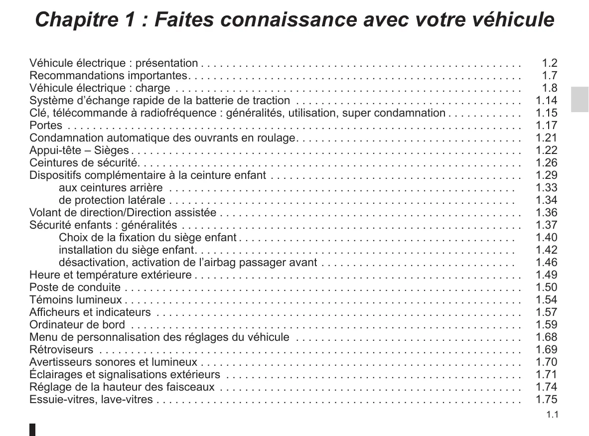Véhicule électrique : présentation. . . . . . . . . . . . . . . . . . . . . . . . . . . . . . . . . . . . . . . . . . . . . . . . . . . Recommandations importantes. . . . . . . . . . . . . . . . . . . . . . . . . . . . . . . . . . . . . . . . . . . . . . . . . . . . . Véhicule électrique : charge . . . . . . . . . . . . . . . . . . . . . . . . . . . . . . . . . . . . . . . . . . . . . . . . . . . . . . . Système d’échange rapide de la batterie de traction . . . . . . . . . . . . . . . . . . . . . . . . . . . . . . . . . . . . Clé, télécommande à radiofréquence : généralités, utilisation, super condamnation. . . . . . . . . . . . Portes . . . . . . . . . . . . . . . . . . . . . . . . . . . . . . . . . . . . . . . . . . . . . . . . . . . . . . . . . . . . . . . . . . . . . . . . Condamnation automatique des ouvrants en roulage. . . . . . . . . . . . . . . . . . . . . . . . . . . . . . . . . . . . Appui-tête – Sièges. . . . . . . . . . . . . . . . . . . . . . . . . . . . . . . . . . . . . . . . . . . . . . . . . . . . . . . . . . . . . . Ceintures de sécurité. . . . . . . . . . . . . . . . . . . . . . . . . . . . . . . . . . . . . . . . . . . . . . . . . . . . . . . . . . . . . Dispositifs complémentaire à la ceinture enfant . . . . . . . . . . . . . . . . . . . . . . . . . . . . . . . . . . . . . . . . aux ceintures arrière . . . . . . . . . . . . . . . . . . . . . . . . . . . . . . . . . . . . . . . . . . . . . . . . . . . . . . . de protection latérale. . . . . . . . . . . . . . . . . . . . . . . . . . . . . . . . . . . . . . . . . . . . . . . . . . . . . . . Volant de direction/Direction assistée. . . . . . . . . . . . . . . . . . . . . . . . . . . . . . . . . . . . . . . . . . . . . . . . Sécurité enfants : généralités . . . . . . . . . . . . . . . . . . . . . . . . . . . . . . . . . . . . . . . . . . . . . . . . . . . . . . Choix de la fixation du siège enfant. . . . . . . . . . . . . . . . . . . . . . . . . . . . . . . . . . . . . . . . . . . . installation du siège enfant. . . . . . . . . . . . . . . . . . . . . . . . . . . . . . . . . . . . . . . . . . . . . . . . . . . désactivation, activation de l’airbag passager avant. . . . . . . . . . . . . . . . . . . . . . . . . . . . . . . Heure et température extérieure. . . . . . . . . . . . . . . . . . . . . . . . . . . . . . . . . . . . . . . . . . . . . . . . . . . . Poste de conduite. . . . . . . . . . . . . . . . . . . . . . . . . . . . . . . . . . . . . . . . . . . . . . . . . . . . . . . . . . . . . . . Témoins lumineux. . . . . . . . . . . . . . . . . . . . . . . . . . . . . . . . . . . . . . . . . . . . . . . . . . . . . . . . . . . . . . . Afficheurs et indicateurs . . . . . . . . . . . . . . . . . . . . . . . . . . . . . . . . . . . . . . . . . . . . . . . . . . . . . . . . . . Ordinateur de bord . . . . . . . . . . . . . . . . . . . . . . . . . . . . . . . . . . . . . . . . . . . . . . . . . . . . . . . . . . . . . . Menu de personnalisation des réglages du véhicule . . . . . . . . . . . . . . . . . . . . . . . . . . . . . . . . . . . . Rétroviseurs . . . . . . . . . . . . . . . . . . . . . . . . . . . . . . . . . . . . . . . . . . . . . . . . . . . . . . . . . . . . . . . . . . . Avertisseurs sonores et lumineux. . . . . . . . . . . . . . . . . . . . . . . . . . . . . . . . . . . . . . . . . . . . . . . . . . . Éclairages et signalisations extérieurs . . . . . . . . . . . . . . . . . . . . . . . . . . . . . . . . . . . . . . . . . . . . . . . Réglage de la hauteur des faisceaux . . . . . . . . . . . . . . . . . . . . . . . . . . . . . . . . . . . . . . . . . . . . . . . . Essuie-vitres, lave-vitres. . . . . . . . . . . . . . . . . . . . . . . . . . . . . . . . . . . . . . . . . . . . . . . . . . . . . . . . . .