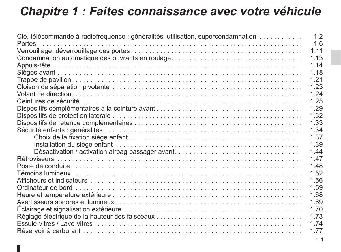 Clé, télécommande à radiofréquence : généralités, utilisation, supercondamnation . . . . . . . . . . . . Portes . . . . . . . . . . . . . . . . . . . . . . . . . . . . . . . . . . . . . . . . . . . . . . . . . . . . . . . . . . . . . . . . . . . . . . . . Verrouillage, déverrouillage des portes. . . . . . . . . . . . . . . . . . . . . . . . . . . . . . . . . . . . . . . . . . . . . . . Condamnation automatique des ouvrants en roulage. . . . . . . . . . . . . . . . . . . . . . . . . . . . . . . . . . . . Appuis-tête . . . . . . . . . . . . . . . . . . . . . . . . . . . . . . . . . . . . . . . . . . . . . . . . . . . . . . . . . . . . . . . . . . . . Sièges avant. . . . . . . . . . . . . . . . . . . . . . . . . . . . . . . . . . . . . . . . . . . . . . . . . . . . . . . . . . . . . . . . . . . Trappe de pavillon. . . . . . . . . . . . . . . . . . . . . . . . . . . . . . . . . . . . . . . . . . . . . . . . . . . . . . . . . . . . . . . Cloison de séparation pivotante . . . . . . . . . . . . . . . . . . . . . . . . . . . . . . . . . . . . . . . . . . . . . . . . . . . . Volant de direction. . . . . . . . . . . . . . . . . . . . . . . . . . . . . . . . . . . . . . . . . . . . . . . . . . . . . . . . . . . . . . . Ceintures de sécurité. . . . . . . . . . . . . . . . . . . . . . . . . . . . . . . . . . . . . . . . . . . . . . . . . . . . . . . . . . . . . Dispositifs complémentaires à la ceinture avant. . . . . . . . . . . . . . . . . . . . . . . . . . . . . . . . . . . . . . . . Dispositifs de protection latérale. . . . . . . . . . . . . . . . . . . . . . . . . . . . . . . . . . . . . . . . . . . . . . . . . . . . Dispositifs de retenue complémentaires. . . . . . . . . . . . . . . . . . . . . . . . . . . . . . . . . . . . . . . . . . . . . . Sécurité enfants : généralités . . . . . . . . . . . . . . . . . . . . . . . . . . . . . . . . . . . . . . . . . . . . . . . . . . . . . . Choix de la fixation siège enfant . . . . . . . . . . . . . . . . . . . . . . . . . . . . . . . . . . . . . . . . . . . . . . Installation du siège enfant . . . . . . . . . . . . . . . . . . . . . . . . . . . . . . . . . . . . . . . . . . . . . . . . . . Désactivation / activation airbag passager avant. . . . . . . . . . . . . . . . . . . . . . . . . . . . . . . . . . Rétroviseurs . . . . . . . . . . . . . . . . . . . . . . . . . . . . . . . . . . . . . . . . . . . . . . . . . . . . . . . . . . . . . . . . . . . Poste de conduite. . . . . . . . . . . . . . . . . . . . . . . . . . . . . . . . . . . . . . . . . . . . . . . . . . . . . . . . . . . . . . . Témoins lumineux. . . . . . . . . . . . . . . . . . . . . . . . . . . . . . . . . . . . . . . . . . . . . . . . . . . . . . . . . . . . . . . Afficheurs et indicateurs . . . . . . . . . . . . . . . . . . . . . . . . . . . . . . . . . . . . . . . . . . . . . . . . . . . . . . . . . . Ordinateur de bord . . . . . . . . . . . . . . . . . . . . . . . . . . . . . . . . . . . . . . . . . . . . . . . . . . . . . . . . . . . . . . Heure et température extérieure. . . . . . . . . . . . . . . . . . . . . . . . . . . . . . . . . . . . . . . . . . . . . . . . . . . . Avertisseurs sonores et lumineux. . . . . . . . . . . . . . . . . . . . . . . . . . . . . . . . . . . . . . . . . . . . . . . . . . . Éclairage et signalisation extérieure. . . . . . . . . . . . . . . . . . . . . . . . . . . . . . . . . . . . . . . . . . . . . . . . . Réglage électrique de la hauteur des faisceaux. . . . . . . . . . . . . . . . . . . . . . . . . . . . . . . . . . . . . . . . Essuie-vitres / Lave-vitres. . . . . . . . . . . . . . . . . . . . . . . . . . . . . . . . . . . . . . . . . . . . . . . . . . . . . . . . . Réservoir à carburant . . . . . . . . . . . . . . . . . . . . . . . . . . . . . . . . . . . . . . . . . . . . . . . . . . . . . . . . . . . .