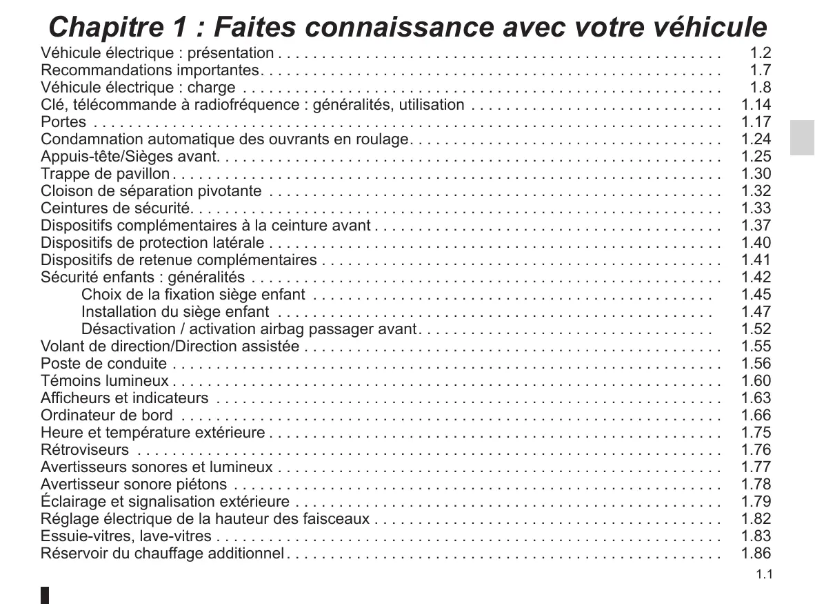 Véhicule électrique : présentation Recommandations importantes Véhicule électrique : charge ...... Clé, télécommande à radiofréquence : généralités, utilisation Portes ........................................... Condamnation automatique des ouvrants en roulage. . ..…. Appuis-tête/Sièges avant. ........................................................ Trappe de pavillon.........................................................,..20 Cloison de séparation pivotante . Ceintures de sécurité. . ........ Dispositifs complémentaires à la ceinture avant Dispositifs de protection latérale ................................................... Dispositifs de retenue complémentaires . Sécurité enfants : généralités . ........ Choix de la fixation siège enfant Installation du siège enfant .................................................. Désactivation / activation airbag passager avant. Volant de direction/Direction assistée . ............. sue see .. Poste de conduite ............................................................... Témoins lumineux. ................................................4...000ee ee Afficheurs et indicateurs . . Ordinateur de bord ........ Heure et température extérieure Rétroviseurs ................................................................... Avertisseurs sonores et lumineux Avertisseur sonore piétons Éclairage et signalisation extérieure Réglage électrique de la hauteur des faisceaux ........................................ Essuie-vitres, lave-vitres ................ Réservoir du chauffage additionnel